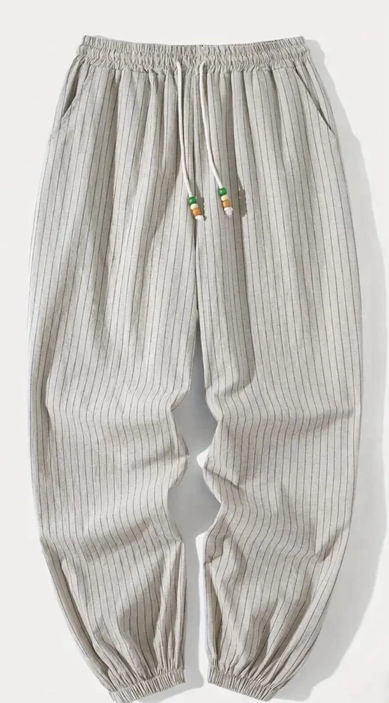 Men’s Cotton Linen Striped Joggers With Drawstring- Casual Loose Fit Pants