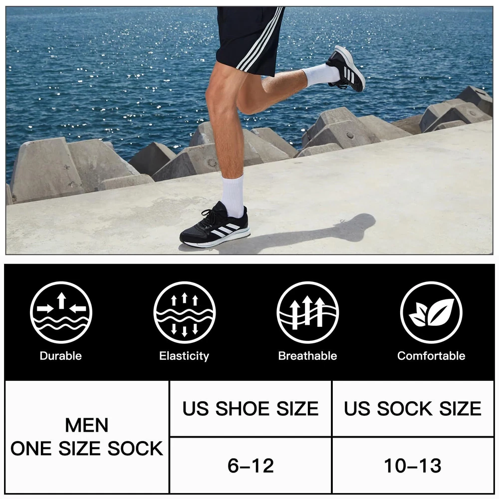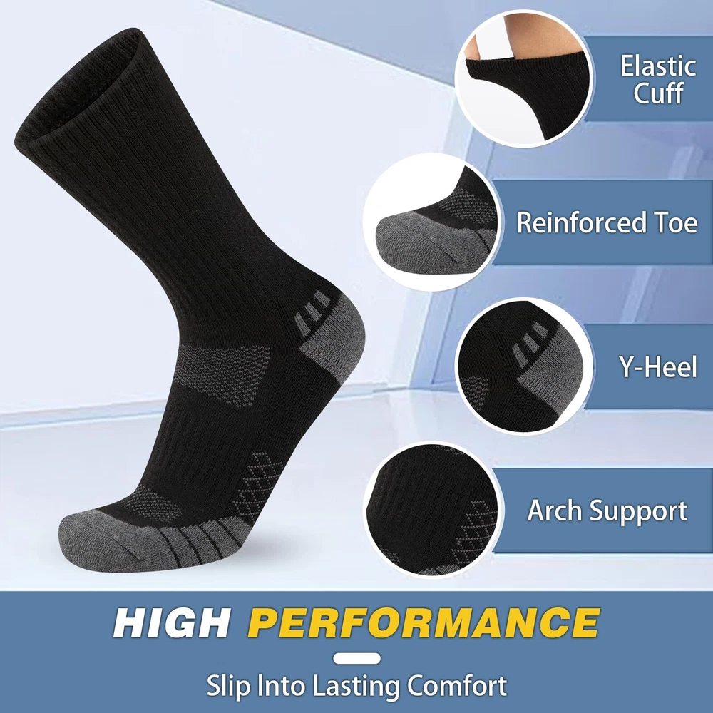 [Moisture Wicking & Comfortable]:The crew socks for men are made of 95% polyester and 5% spandex. These mens crew socks are designed with breathable mesh to quickly wick away moisture and keep feet dry.Suit for US Mens Shoe Size 6-12(Mens Sock Size 10-13). [Thick Cushion Athletic Socks]:These mens socks crew designed with heavy cushion,which provides good cushioning and shock absorption when you are walking, running or doing other sports. It can reduce the pressure on the feet, reduce the impact of sports on the joints and bones of the feet, and protect the health of the feet. [Durable Reinforced Design]:Reinforced toe and heel design increases the abrasion resistance and longevity of the mens socks, providing you with a more reliable wearing experience.men's crew socks are designed for durability to ensure they stand up to the rigors of everyday wear and outdoor activities. [Great Elasticity-Arch Support]: The elasticized cuff fits snugly around the leg, preventing the athletic crew socks men from slipping off without putting pressure on the leg.Arch support reduces fatigue and discomfort during prolonged wear, providing good protection and support for your feet. [Best Customer Service]:There are white crew socks, black crew socks and grey crew socks.Each package contains 6 pairs of mens socks.If you have any problem about our work socks, please contact us! We will solve your problem as soon as possible till your satisfaction.