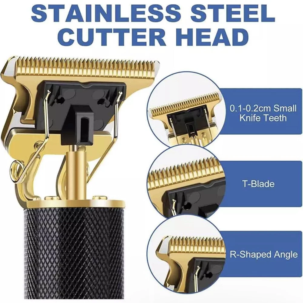 Hair Clippers and Beard Trimmer for Men – Professional Grooming Kit Achieve the perfect haircut and beard trim with this powerful, easy-to-use hair clipper and trimmer. Designed for both professional and home use, it features a high-performance motor, low vibration, and an ultra-quiet operation, making it ideal for creating various hairstyles with precision. The cordless design allows for easy maneuverability, whether you’re at home, work, or traveling. Key Features: • R-Shaped Sharp Angle Design: The trimmer’s R-shaped design prevents skin irritation while providing a sharp, wear-resistant blade for smooth cuts. • Ergonomic & Non-Slip Handle: The clipper features an exquisite, comfortable handle with carved patterns, making it easy to grip for a precise trim. The low noise operation ensures a quiet, pleasant grooming experience. • Powerful & Sharp Performance: Quickly captures and cuts hair evenly, saving time and effort. The waterproof design allows for easy cleaning under running water. • Low Noise Operation: Enjoy a quiet grooming experience without disturbing those around you, perfect for early mornings or when your baby is sleeping. • Perfect Gift: With its sleek design and quality craftsmanship, this hair clipper makes an excellent gift for any man – ideal for your boyfriend, husband, father, or friend. Specifications: • Color: Gold, Black • Power: 5W • USB Cable: 5V • Battery: 1200mAh Li-ion Battery • Operating Time: Up to 2 hours • Charge Time: 2 hours • Charging Method: USB Charging Package Includes: • 1 x Hair Clipper • 1 x USB Charging Cable • 1 x Cleaning Brush • 1 x User Manual • 1 x Gift Box • 4 x Limit Combs Perfect for personal use or as a thoughtful gift, this hair clipper and beard trimmer will keep you looking sharp with every trim.