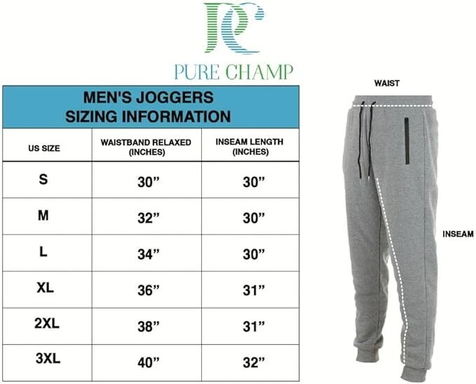 Pure Champ US ATHLETIC WORKOUT JOGGER Size chart: Brand Size USA Waist (in) Inseam (in) S S 30 30 M M 32 30 L L 34 30 XL XL 36 31 2XL 2XL 38 31 3XL 3XL 40 32 Men's Fleece Lined Slim Fit Casual Tech Jogger Sweatpants Zipper Pockets About this item Versatile Activewear: Whether you’re looking for a comfortable pair of mens pants that will withstand your intense jogging routine or you simply want to add a modern touch to your casual look, the Pure Champ mens lounge pants are exactly what you need! Premium Super Soft Fabric: These Mens sweatpants are made using finest quality fabric blends, with 60% cotton and 40% polyester, being easy to wash and designed to withstand the test of time without discoloration or shrinking. Modern and Casual Colors: Our mens jogger pants come in a variety of attractive color choices, being easy to mix and match with your favorite t-shirt and sneakers! Each pack includes 3 pairs of sweatpants, choose from: black/heather gray/charcoal, black/navy/charcoal, black/heather/olive, black/natural/olive, black/black/black. Zipper Pockets: Unlike similar products on the market, our gym pants men feature 3 individual pockets, one on the back and 2 front zippered, ideal for storing your wallet, keys, smartphone or other essentials Lightweight & Comfortable: Featuring a durable ribbed elastic waistband and jogger style bottom cuffs, functional drawstring with silver tips for a finished touch, 4-Way stretch with super soft and skin friendly fleece touch, these mens sweats are incredibly lightweight allowing the skin to breathe yet keeping you warm Multi-purpose Fleece Joggers: Perfect for all outdoor activities like training, basketball ,football, soccer, jogging, track, cycling, climbing, hiking ,training, gym practice, bodybuilding,/ weightlifting, performance or any other type of sports activities as well as casual and loungewear Product Description Pure Champ is a premium brand that focuses on delivering unique and versatile men’s and women’s activewear meant to add comfort and elegance to your everyday activities, without interfering with your personal style. We work exclusively with superior quality fabrics and trustworthy manufacturers, in order to meet the most rigorous standards and expectations of our worldwide customers. Encountering issues with your purchase? Our customer care department is entirely at your disposal and will immediately address your concerns! Premium Fleece Jogger Bottoms – A Must In Every Gentleman’s Wardrobe The Pure Champ lounge pants men perfectly combine comfort with style, allowing you to go about your casual activities feeling confident and good looking! Made with carefully selected skin-friendly fabrics, with a highly comfortable drawstring elastic waistline, flattering fit and optimal leg length, these men’s joggers sweatpants will nicely compliment your favorite t-shirt and sports footwear! Still not convinced? Here are some of the amazing features of these mens sweatpants: Arrives in convenient packs of 3; Available in 5 different color packs: black/heather gray/charcoal, black/navy/charcoal, black/heather/olive, black/natural/olive, black/black/black; Sizes: S-3XL; Material: 60% cotton, 40% polyester; 2 multifunctional front zippered pockets, 1 back pocket; super soft fleece feels great on your skin; Elastic waist for added comfort; Drawstring design; Modern and elegant fit; Ideal for running,walking, working out, daily activities; Original gift idea for him, best friend, husband, Father’s Day; Add a modern vibe to your casual outfits with these premium mens joggers with pockets!
