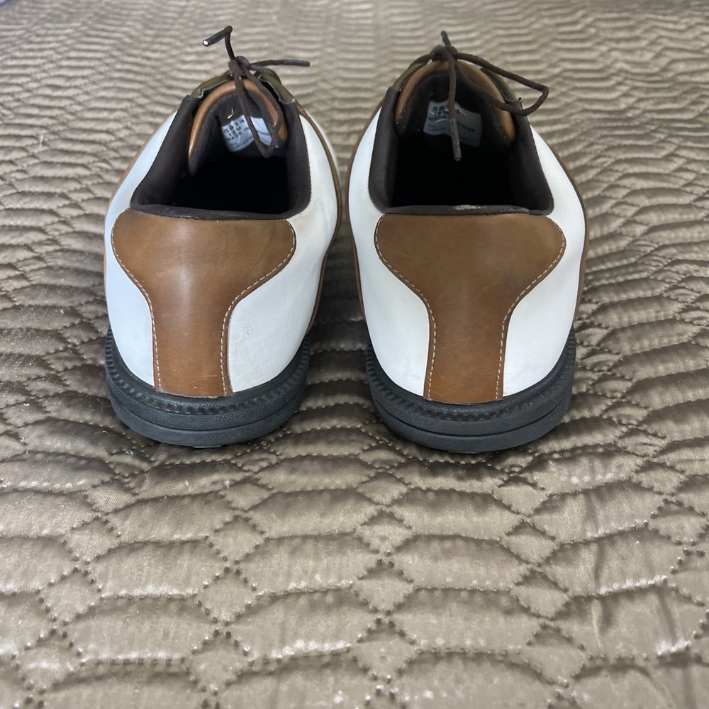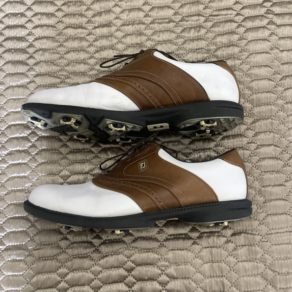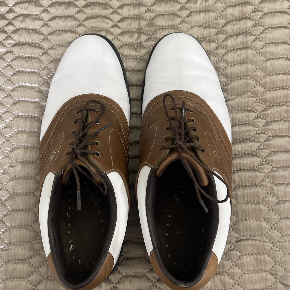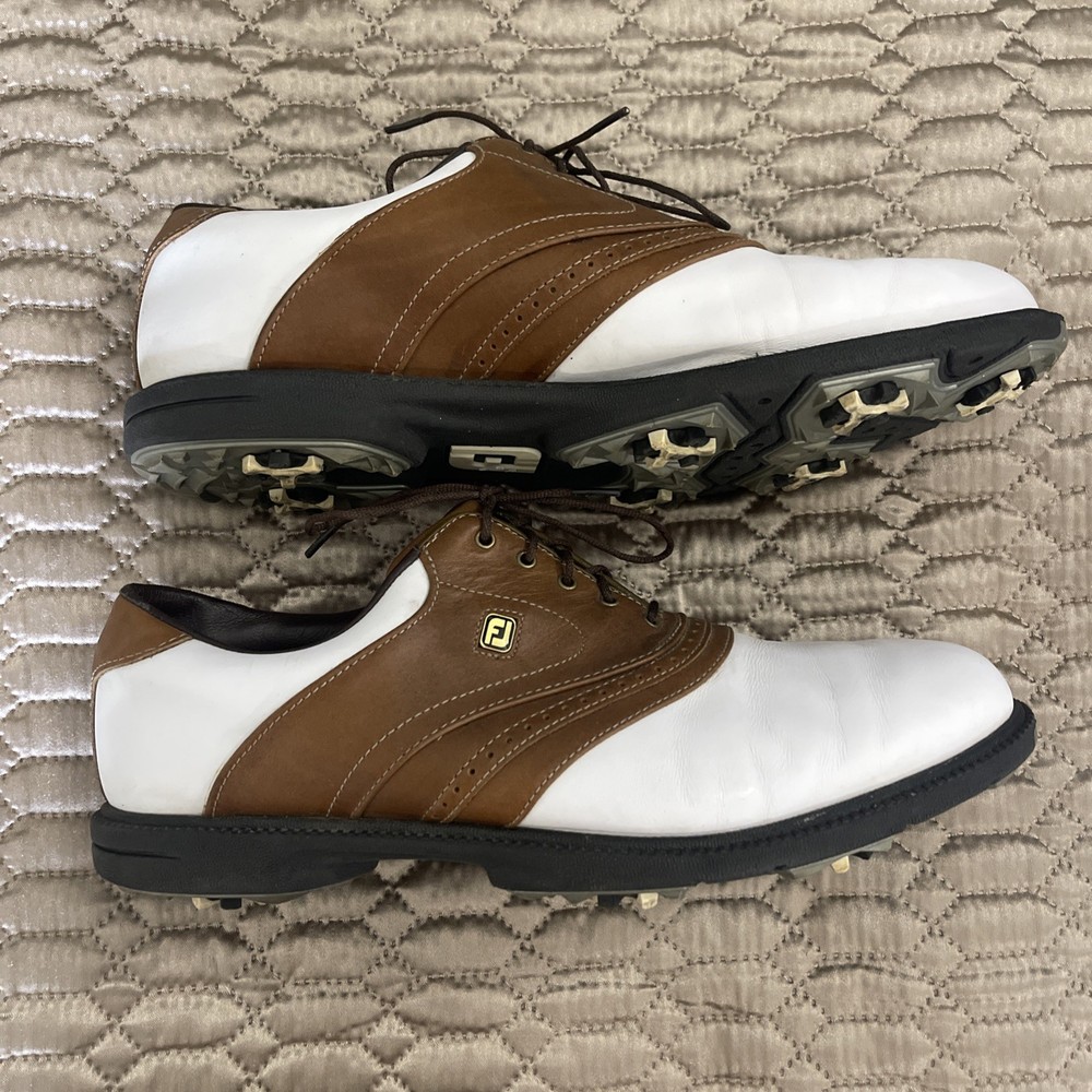 The FootJoy Men's Golf Shoes in White/Brown, size 12, are designed for activewear occasions, specifically for golfing. These athletic shoes feature a synthetic lining, leather upper material, and a rubber outsole for durability and comfort. The saddle style shoe with a dog theme is part of the FootJoy Fit Dogs product line, ensuring a high-quality fit and performance on the golf course. Made in China, these shoes are an excellent choice for any golfer looking for style and functionality in their footwear.