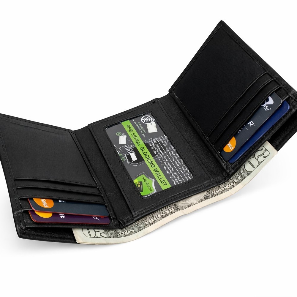 Men's Genuine Leather RFID Security Black Trifold Wallet Men's Genuine Leather RFID Trifold Wallet Trifold Holds 8 Credit Cards 1 Clear ID Window 2 Extra Slots for business cards or receipts A bill compartment and an Inside Zipper RFID Protection Comes in Box Color: Black Free Shipping with tracking