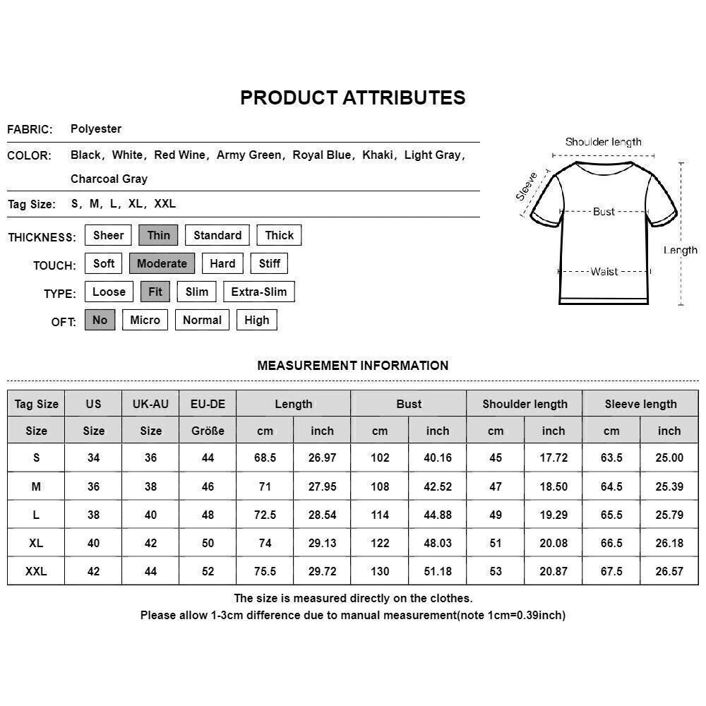 You may also like Mens Stretch Turtle Neck Under Shirt Long Sleeve Winter Warm Thermal Jumper Tops 20.79 USD Free shipping Mens Summer Linen Button T-Shirt Size Casual Loose Long Sleeve Blouse Tops Beach 19.49 USD Free shipping Mens Henley T Shirt Grandad Button V Neck Autumn Casual Long Sleeve Shirts Tops 14.09 USD Free shipping Mens Turtle High Neck Jumper Tops Shirts Long Sleeve Casual Slim Pullover Blouse 17.49 USD Free shipping Mens Short Sleeve Shirts Tee Casual Business Golf Zipper Slim Fit T-shirt Tops 19.39 USD Free shipping Mens Solid Button Long Sleeve Shirts Business Formal Casual Slim Fit Blouse Tops 24.29 USD Free shipping Mens Short Sleeve Shirts Casual Business Golf Zipper Muscle Fitted Tops T-shirt 20.29 USD Free shipping Mens Shirts Golf Long Sleeve T-Shirt Work Lapel Neck Sport Casual Blouse US 26.39 USD Free shipping Mens Solid Sport Tank Tops Vest Bodybuilding Training Gym Fitness Muscle T Shirt 18.19 USD Free shipping Men's Button Collar Short Sleeve Plain Shirt Casual Blouse Sport Tops T Shirt 17.79 USD Free shipping ⭐⭐⭐Men's Sleeveless Casual Muscle T-shirt Tank Tops Gym Sports Fitness Tee Tops 15.69 USD Free shipping Men Casual Long Sleeve T-shirt Button V Neck Sports Casual Solid Tee Shirt Tops 26.79 USD Free shipping SAFE & SECURE SHOPPING 100% SATISFACTION GUARANTEED FAST SHIPPING Men's Long Sleeve Solid Pullover T Shirt Casual Slim Fit Round Neck Tops Blouse Product Description Product Features: Sleeve Length:Long Sleeve Sleeve Type:Regular Neckline:Round Neck Material:Polyester Fabric Type:Waffle Pattern:Solid Closure:Pullover Occasion:Elegant fashion Season:Spring/Autumn Department:Men Size Type:Regular Collar Style:O-Neck Type:T-Shirt Fit:Classic Features:buttons Clothing Length:Regular Applicable Scene:Daily Applicable Season:Spring and Autumn About This Item(We aim to show you accurate product information) 1.The Real Object May Exist Slightly Colors Differences Compared To Images As Different Computers Display.Caution If Minding,Thanks. 2.There Might Be A Manual Measuring 1-3 cm Error.Sorry For Any Inconvenience(note 1cm=0.39inch) . 3.Please Prevail On Real Item, Model Images For Reference Only. 4.Attention!!!Please check the size chart carefully before placing the order. Thanks for your understanding. Package Content: 1 x Top Size C hart: Size-Details Tag Size UK Size EU Size US Size length Bust Shoulder length Sleeve length cm inch cm inch cm inch cm inch S 36 44 34 68.5 26.97 102 40.16 45 17.72 63.5 25.00 M 38 46 36 71 27.95 108 42.52 47 18.50 64.5 25.39 L 40 48 38 72.5 28.54 114 44.88 49 19.29 65.5 25.79 XL 42 50 40 74 29.13 122 48.03 51 20.08 66.5 26.18 2XL 44 52 42 75.5 29.72 130 51.18 53 20.87 67.5 26.57 Sleeve Length:Long Sleeve Sleeve Type:Regular Neckline:Round Neck Material:Polyester Fabric Type:Waffle Pattern:Solid Closure:Pullover Occasion:Elegant fashion Accents:Other Season:Spring/Autumn Department:Men Size Type:Regular Collar Style:O-Neck Theme:NO Type:T-Shirt Fit:Classic Features:buttons Hooded:No Clothing Length:Regular Applicable Scene:Daily Applicable Season:Spring and Autumn Shirts Type:NO Payment Shipping Returns Contact Us Payment We ship to your eBay or Paypal address. Please make sure your eBay and Paypal address is correct before you pay. Shipping All orders will be processed and shipped within 48 hours, Monday to Friday in most cases. Most packages will be shipped via USPS First Mail, it usually takes 3-7 days for delivery. A tracking number will be emailed to you upon shipment. Please note that USPS does not update tracking information location by location. We only ship to address that you input during Paypal checkout. Buyers are responsible for wrong or undeliverable address. Returns Please see the size reference to find the correct size. There may be slightly color difference cause of light shooting. Please allow 1-3cm difference due to manual measurement(note 1cm=0.39inch) Returns will be accepted within 60 days after delivery. However, if the item is damaged upon arrival, buyers must contact us within 3 days after delivery for any refund or replacement. Returns will not be accepted if buyers caused any damages to the item. Refunds are given as Exchange or Money Back. Contact Us Please be patient when contacting us, all messages will be replied within 12 hours. Customer Service from 9:00 am - 6:00 pm on Business Days. Please let us know immediately if a package is damaged upon arrival. Feel free to contact us if you’d like to combine shipping on your purchases. We appreciate your feedback and we will send buyers positive feedback after a shipment has been processed. Customer satisfaction is significant to us. If you are dissatisfied with a transaction for any reason. Before taking any action, please contact us through eBay and we will do everything we can to help you. Copyright © 2022 Tongtool