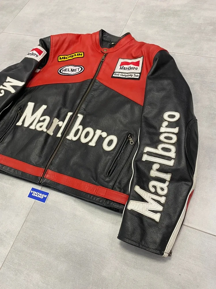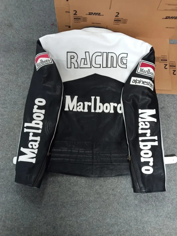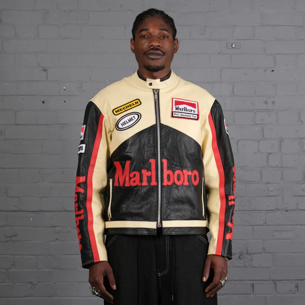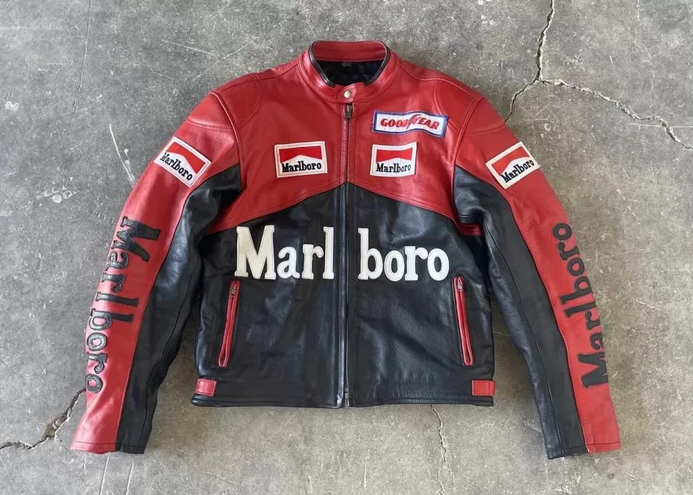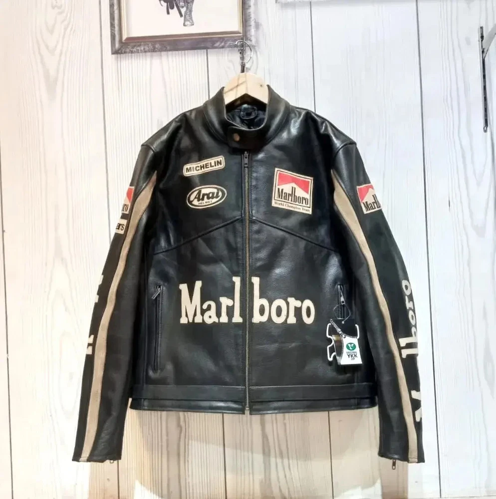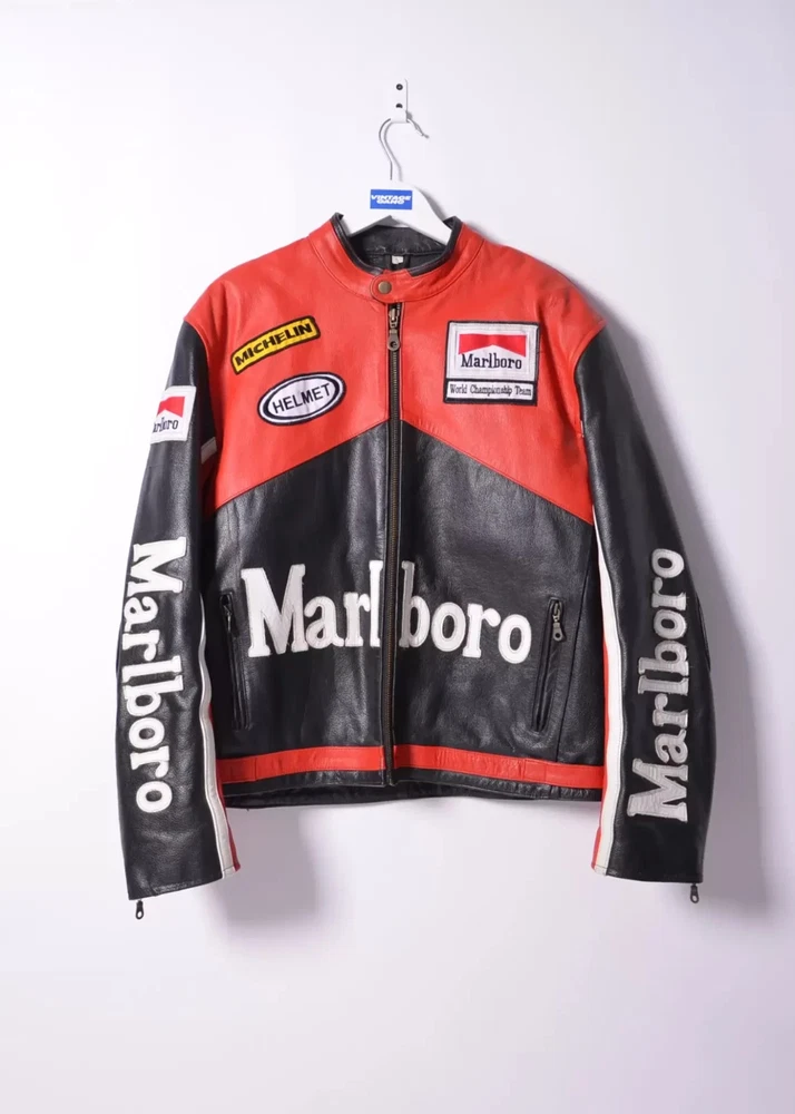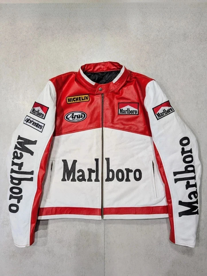 Men's Marlboro Racing Multicolor Motorcycle Biker Genuine Cowhide Leather Jacket Product Description: Turn heads and ride with confidence in the Men’s Marlboro Racing Multicolor Leather Jacket — a bold tribute to classic motorsport culture. Featuring a striking mix of red, white, yellow, and black , this jacket is inspired by vintage racing designs and the iconic Marlboro branding that defined an era of speed and rebellion. Made from high-quality genuine cowhide leather , this jacket is built to withstand the road while offering a stylish, race-ready look. The multicolor panel design , coupled with embroidered and printed racing logos, makes it a standout piece for riders who want to make a strong impression on and off the bike. Features: Constructed from 100% genuine cowhide leather (1.2mm – 1.3mm thick) Iconic Marlboro racing logos and detailing for authentic style Bold multicolor design : red, white, yellow & black for a true racing aesthetic Durable YKK front zipper , zippered cuffs, and waist adjustment straps Polyester inner lining for all-day comfort and breathability Optional removable CE armor padding at shoulders, elbows, and back Functional inner and outer pockets for convenience Suitable for motorcycling, casual wear, or motorsport events Perfect for riders and collectors alike, this jacket delivers a vintage racing vibe with modern craftsmanship. Make every ride a statement.