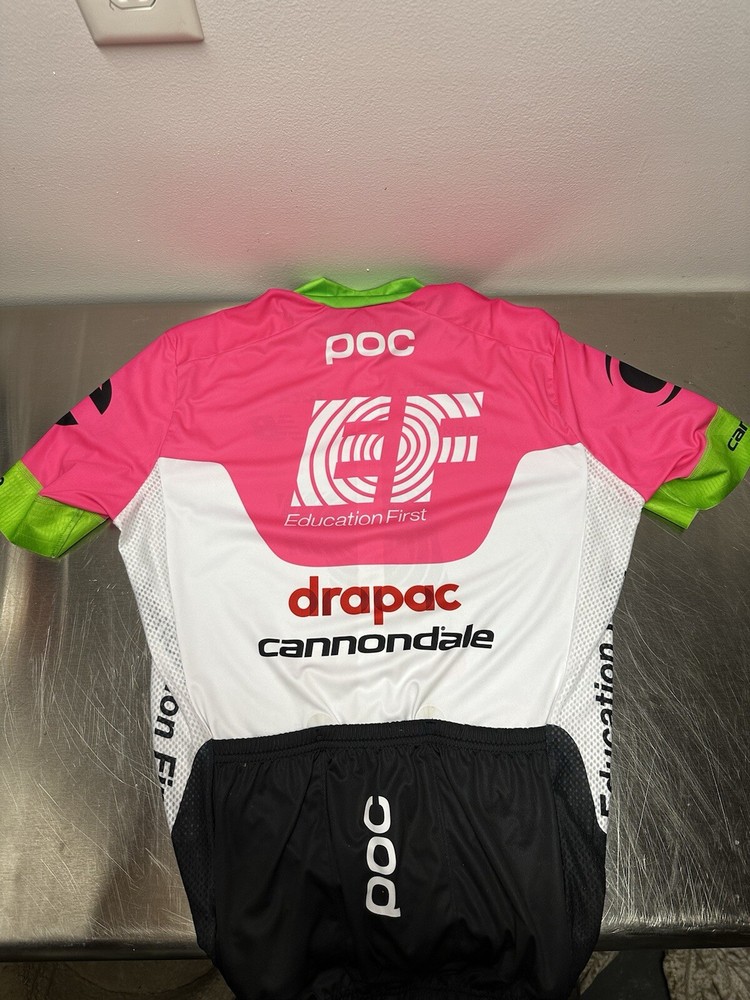 POC Cannondale EF Drapac Pro Team Cycling Jersey. Men’s size medium. There are a few, minor scuffs on the front of the jersey (see pictures). Most likely can be removed w/ stain remover when washing. Only worn twice. In good shape. Fit is not too tight, it’s comfortable.