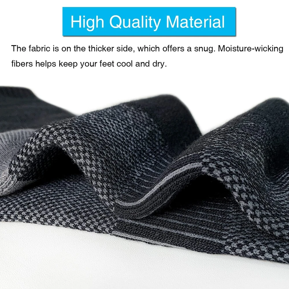 Description Men's Moisture Wicking Cushioned Crew Work Boot Socks, Size 9-12, Black, 6 Pairs For Work and Boot - The Boot Socks are soft, lightweight, breathable. Come with moisture wicking fabric that absorbs sweat to help keep feet dry and odor resistant. Cushioned Work Socks - Padded sole, just the right amount of padding for comfort, impact absorption to relieve foot pain. Sturdy & Durable - Made of strong two-strand polyester fibers, and reinforced toe and heel for durability. Reduce Swelling - Targeted compression in calf area, helps improve blood flow and reduce swelling during long standing. Dry & Fit - Good stretch, stay up and a snug fit, keep socks in place. Idear for for work boot, steel toe boot, construction, heavy duty work, military, army boot, driver, cowboy.