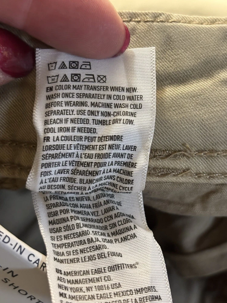 Elevate your casual wardrobe with these American Eagle Flex cargo shorts in beige. These shorts feature a solid pattern, zip closure, and flat front. The cotton and elastane material with a knit fabric type and mid-rise fit make them comfortable and stretchy. The cargo pockets provide ample space for your essentials, and the button accents add a touch of style. These shorts are machine washable, making them easy to care for. Perfect for a casual day out, these shorts are a wardrobe staple for any fashion-conscious man.