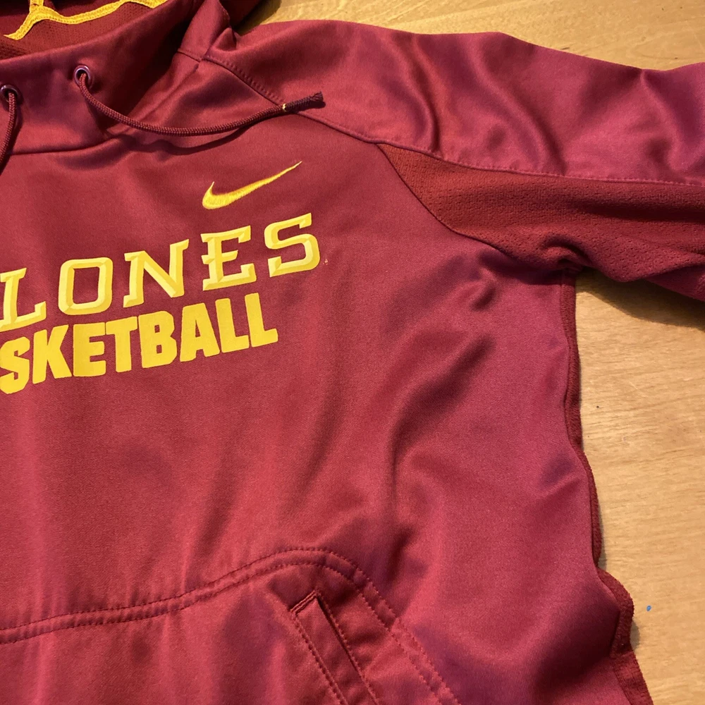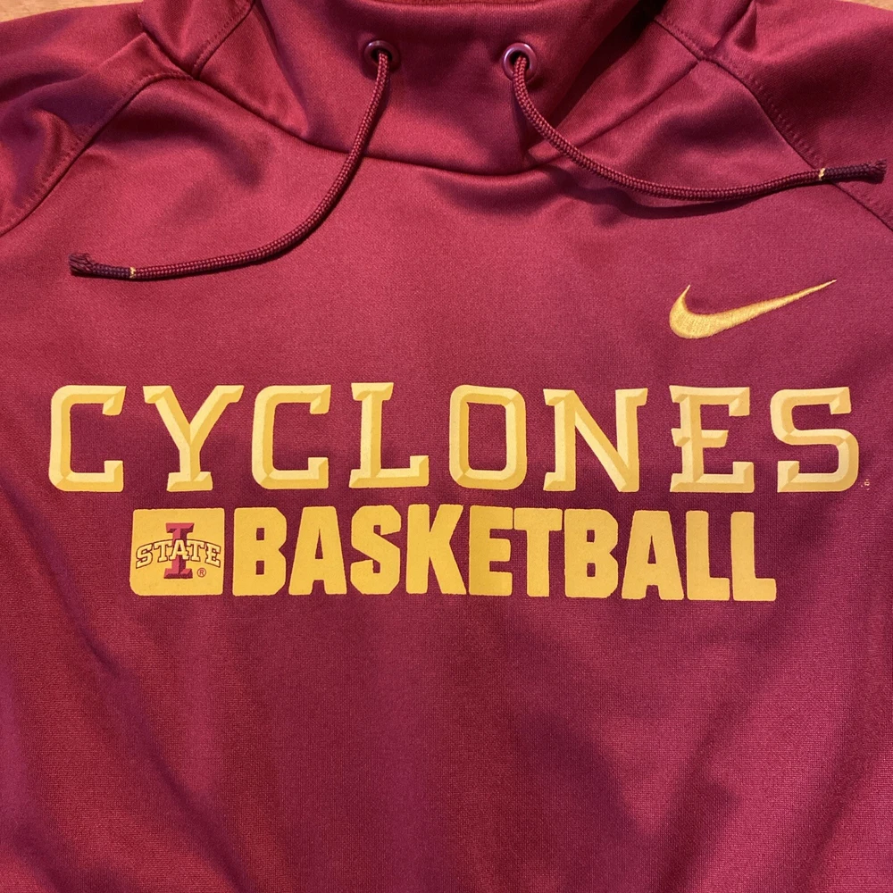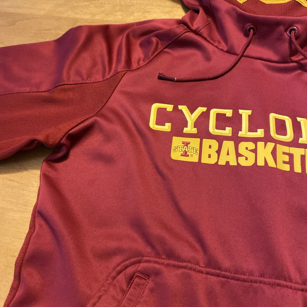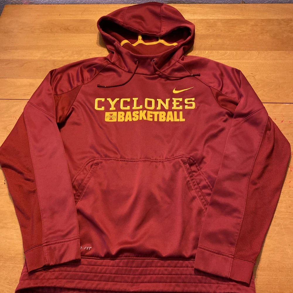 Show your support for the Iowa State Cyclones with this officially licensed Nike Dri Fit sweatshirt. Made for men, this red hoodie is perfect for basketball fans who want to stay comfortable and stylish. The size small sweatshirt features the Iowa State Cyclones team logo and is made with Nike's signature Dri Fit technology, keeping you cool and dry during intense games. Whether you're at the gym or cheering on your team at the arena, this sweatshirt is a must-have for any Iowa State Cyclones fan. This is a pre owned sweatshirt and looks big for a small please look over pictures and measurements