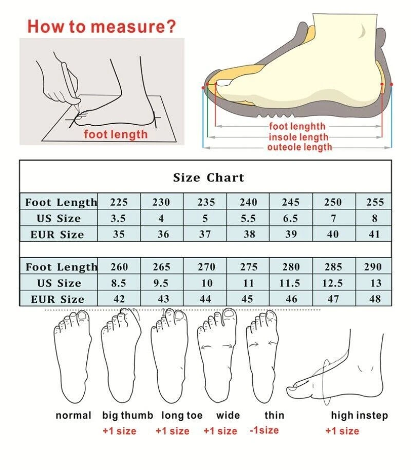 Size Note NOTE:Please choose the shoes size according to your foot length,NOT insole length. If the your feet is wide or thick, please choose a larger shoes size. Before choose you USA or EUR size , you had better measure your feet length. How to Measure Feet Length Please measure your feet length carefully ,with the method of the picture below: