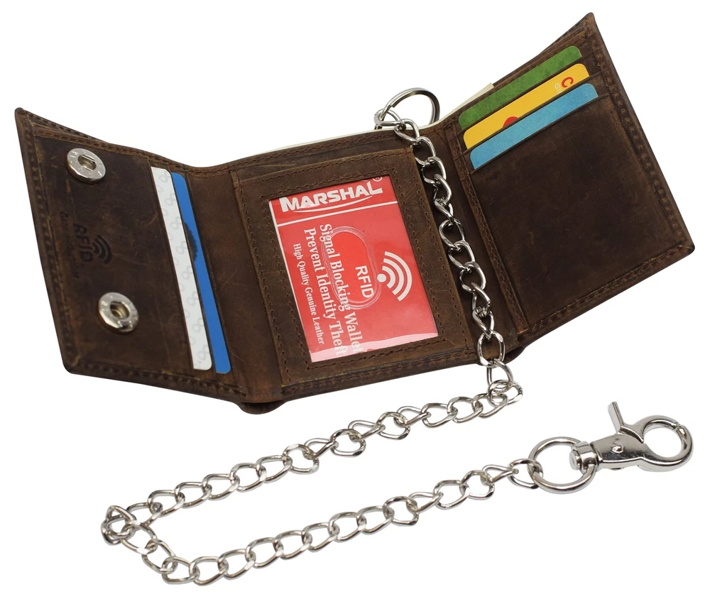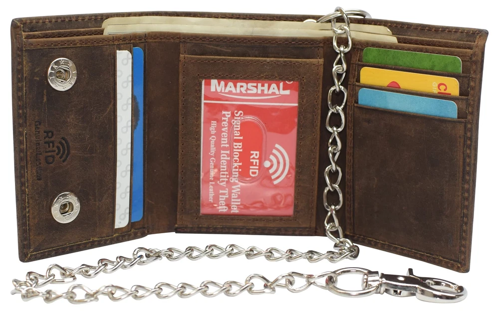 Description · Purchasing this wallet will help you avoid the pain of having your wallet stolen. The chain clips into your belt loop for the convince of our customers and enhances the style of your outfit. This beautiful wallet, is for men or women for everyday use, also for Biker, Trucker, and Motorcycle drivers. Delicate design and neatly stitched to ensure its longevity, Best quality, Premium cowhide leather makes this wallet looks very luxurious and durable, this Vintage distressed and unique design makes this wallet the right choice.. The RFID feature in this wallet really takes the safety of our customers to the next level. The aluminum lining that is embedded in this wallet, blocks the signals for radio frequency identification. This technology will prevent your credit card information from falling into the wrong hands. 7 Credit Card Slots, 1 ID Window, 1 Fast Access Card Slot in the back, 2 Bill Compartments, Snap Closure The finishing lining of the wallet is turned and stitched to enhance the durability of the wallet making sure the wallet lasts a long time to give you the most out of your money. 18" Long Stainless Chain including Key Ring & Claw Hook Heavy Thread with Quality Stitching Dimensions: 4.3" H x 3.5" L approx when closed