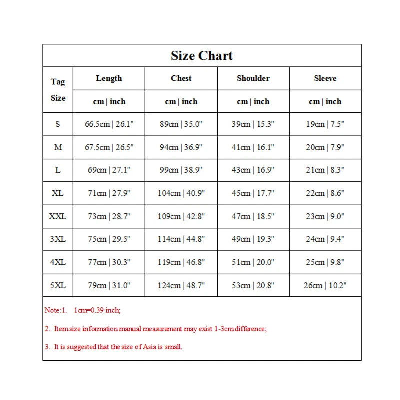 Specifications: 100% Brand new and high quality. Size:S,M,L,XL,XXL,3XL,4XL,5XL Color: white,black,navy blue,dark grey Material: Polyester Sleeve length:short sleeve Neckline:o neck Pattern:solid color Season:summer Note: 1.Due to the light and screen difference, the item's color may be slightly different from the pictures. Please understand. 2.Please allow 2-3% error due to manual measurement.Please make sure you don’t mind before you mid. 3.Size doesn’t fit all.Please carefully check size chart and select the size based on your real size. Care Instructions: Wash before wear Cold gentle machine wash Do not bleach Do not tumble dry Drip dry Package:1 pcs men sport t shirt Size Chart Tag Size Length Chest Shoulder Sleeve cm | inch cm | inch cm | inch cm | inch S 66.5cm | 26.1'' 89cm | 35.0'' 39cm | 15.3'' 19cm | 7.5'' M 67.5cm | 26.5'' 94cm | 36.9'' 41cm | 16.1'' 20cm | 7.9'' L 69cm | 27.1'' 99cm | 38.9'' 43cm | 16.9'' 21cm | 8.3'' XL 71cm | 27.9'' 104cm | 40.9'' 45cm | 17.7'' 22cm | 8.6'' XXL 73cm | 28.7'' 109cm | 42.8'' 47cm | 18.5'' 23cm | 9.0'' 3XL 75cm | 29.5'' 114cm | 44.8'' 49cm | 19.3'' 24cm | 9.4'' 4XL 77cm | 30.3'' 119cm | 46.8'' 51cm | 20.0'' 25cm | 9.8'' 5XL 79cm | 31.0'' 124cm | 48.7'' 53cm | 20.8'' 26cm | 10.2'' Note:1. 1cm=0.39 inch; 2. Item size information manual measurement may exist 1-3cm difference; 3. It is suggested that the size of Asia is small.