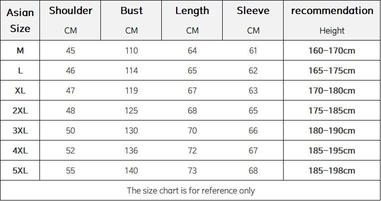 Men Luxury Fashion Trendy Bomber Streetwear Long Sleeve Slim Casual Jacket Coat FAST & FREE DELIVERY | GREAT PRICE | SECURE SHOPPING | HIGH QUALITY Please pay attention! Please strictly follow our size chart carefully to select your correct size. Do not select directly according to your habits. please notice our size is Chinese size, it is 2 size smaller than Europe or US size, so please check the size suggestion carefully before buying! Please note: Due to differences in computer screen displays, the actual color of the item may vary slightly from the images shown. Try our size recommendation: Asian M 55kg / 121 lbs Asian L 60kg / 132 lbs Asian XL 65kg / 143 lbs Asian 2XL 70kg / 154 lbs Asian 3XL 75kg / 165 lbs Asian 4XL 80kg / 176 lbs Asian 5XL 85kg / 187 lbs Size Chart Manufacturer Size IN Size Shoulder Bust Length Sleeve Length Height Weight M-55kg 17.72 43.31 25.20 24.02 62.99-66.93 45kg-60kg L-60kg 18.11 44.88 25.59 24.41 64.96-68.90 55kg-65kg XL-65kg 18.50 46.85 26.38 24.80 66.93-70.87 60kg-70kg 2XL-70kg 18.90 49.21 26.77 25.59 68.90-72.83 65kg-75kg 3XL-75kg 19.69 51.18 27.56 25.98 70.87-74.80 70kg-80kg 4XL-80kg 20.47 53.54 28.35 26.38 72.83-76.77 75kg-85kg 5XL-85kg 21.65 55.12 28.74 26.77 72.83-77.95 80kg-90kg Contact us & Feedback Customer satisfaction is very important to us. If you have any problem with your order, please contact us through eBay messages . We are here to assist you and resolve any issues that arise within 24 hours , so please give us a chance to do so prior to potentially posting any negative feedback. We'd like to be sure you are completely satisfied with your purchase. Payment Policy We give you a fast and secure PayPal Transaction. We also accept: VISA, MasterCard, American Express, Google Pay, Apple Pay, Discovery and many others. Highest safety and security standards are taken so you can feel safe. Shipping Policy All orders are typically processed and shipped within 3 business days. You will receive tracking information automatically uploaded once the item has been shipped. Return & Refund Policy If the item got defects or damaged we provide refund ( 100% moneyback guarantee service) If you have a problem with the item you have got please let us know within a week. It must be returned the item within 30 days after the delivery. Please feel free to contact us via eBay messages if you have any problem with the item without opening a case on the site. We contact you within 24 hours and do our best to help you out! Thank you for shopping with us!