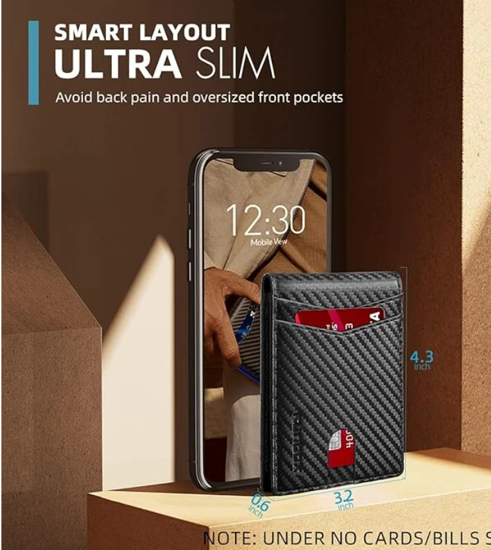 SLIM WALLET, LESS BULK – PREMIUM DESIGN FOR EVERYDAY USE Upgrade your everyday carry with a sleek, functional, and secure slim wallet. Designed to fit comfortably in your front pocket without adding bulk, this minimalist men’s wallet offers high-capacity storage, RFID-blocking security, and a durable premium finish. Perfect for daily use, travel, work, and anyone who wants a compact yet spacious wallet. Key Features & Benefits High-Quality Leather: Crafted from premium microfiber leather for a smooth, durable feel that resists wear and ages beautifully over time. Built for long-lasting performance. Slim Front-Pocket Design: Ultra-thin profile fits comfortably in front or back pockets without creating bulk. Ideal for minimalists and everyday carry. Ample Storage Capacity: Holds up to 11 cards plus cash while maintaining a compact shape. Perfect for credit cards, debit cards, ID, transit cards, membership cards, and business cards. RFID-Blocking Protection: Advanced RFID-blocking layer helps protect your cards from unauthorized scanning and electronic theft. Smart Bifold Layout: Easy-open bifold design provides fast access to your essentials. Organized layout keeps everything in place and easy to reach. Compact Size: 4 x 3.1 x 0.6 inches — optimized to carry more while staying slim. Lightweight Build: Only 2.8 oz, making it a perfect everyday carry wallet for travel, commuting, and daily life. Gift-Ready Packaging: Comes in a premium matte-black gift box, making it an ideal present for birthdays, holidays, Father’s Day, Christmas, and special occasions. Compact & Lightweight Dimensions: 4 x 3.1 x 0.6 inches Weight: Only 2.8 oz Perfect for front-pocket carry, slim travel, or minimal everyday use.