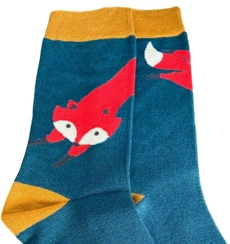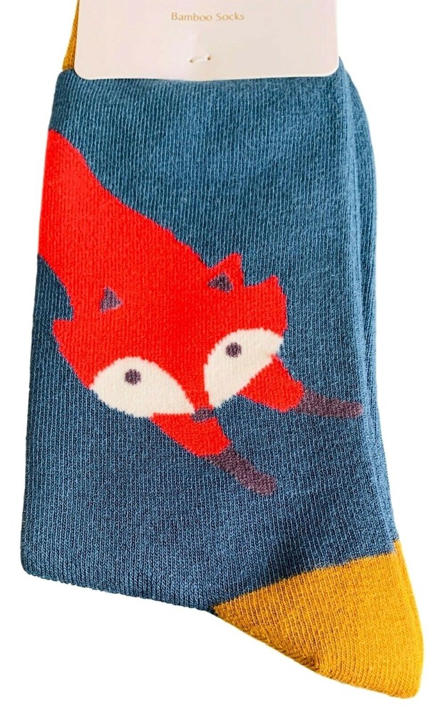 Men's blue and mustard yellow coloured socks with a Fox print. Excellent quality, super soft and stretchy bamboo / cotton blend fabric ( 54% Bamboo, 22% Cotton, 16% Polyester, 6% Nylon, 2% Elastane ) One size ( Mens UK Shoe size 8 - 12 ) New with tags and FREE UK postage.