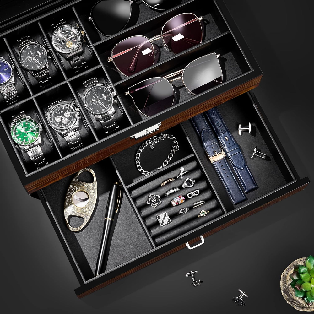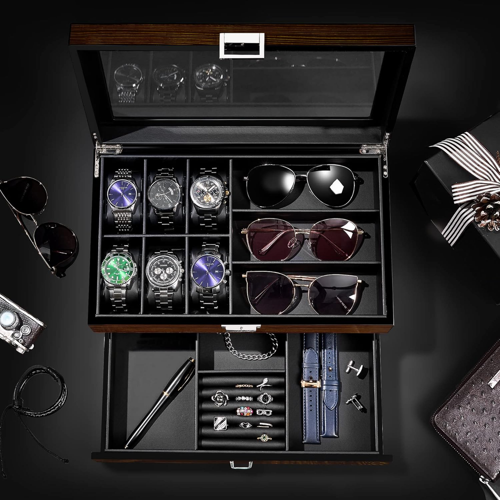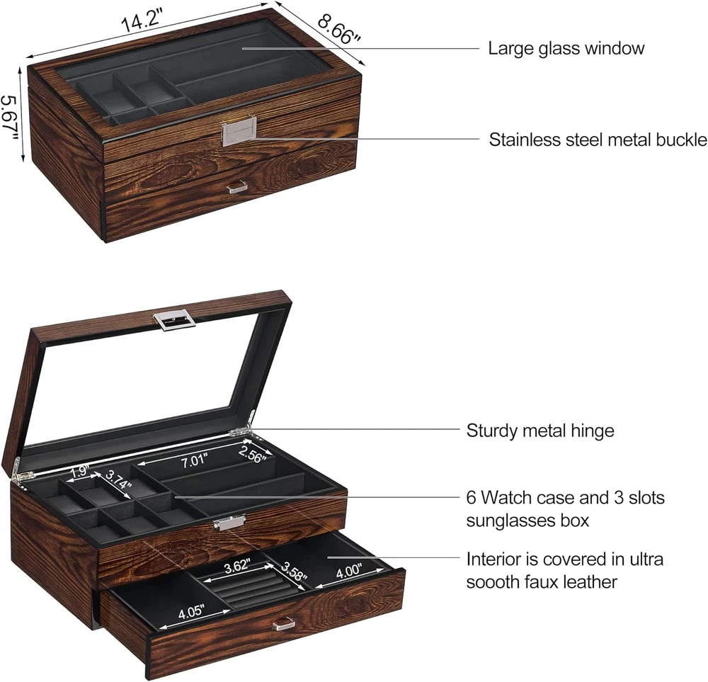Store New Arrivals Add to Favorite View Feedback Contact Watch Box Watch Case Wood Mens Jewelry Box with Valet Drawer Watch Organizer Display Case with Large Glass Lid for Sunglasses Watch Storage, Smooth Faux Leather Interior, Brown SSH32Y Description Item model number SSH32Y Style Modern Number of Items 1 Country of Origin China Warranty Type No Warranty Batteries Included? No Jewelry Storage Type Jewelry Case Batteries Required? No Number of Compartments 9 Special Feature Lock Product Dimensions 8.66"D x 14.2"W x 5.67"H Material Engineered Wood Number of Drawers 1 Finish Type Polished Closure Type Drawstring Item Weight 7.87 pounds Finish Polished Occasion Christmas, New Year, Friendship Day, Birthday Special Features Lock Target Audience Men Part Number SSH32Y Mounting Type Table Top Color Brown Inner Material Faux Leather Shape Rectangular Recommended Uses For Product Watch Included Components 6 watch case with jewelry drawer TOP-NOTCH CRAFT: The watch organizer is made of MDF, Interior is covered with smooth faux leather, watch pillow with PS material and sponge cushions, highlight unique beauty while protect watches and sunglasses from scratching. Perfect for personal or business use and great for shop window watch displaying ORGANIZE YOUR WATCHES AND SUNGLASSES: The first layer offers 6 watch slots and 3 glasses or sunglasses compartments, and the watch holders can be removed if you need upper tier space for other items. The bottom drawer provides additional storage for extra bands, rings, bracelets, tie clips, cuff links and other jewelry accessories NO LONGER CLUTTERED: Nothing more frustrated than having all watches and sunglasses around drawer and room. This sunglass and watch organizer creates a single location for your loved watches and sunglasses ,you don't have to spend time to search for a suitable accessories in the morning and can easily decide which one to wear before going out LARGE REAL GLASS LID: This sunglasses case has a clear top, you will own a broad vision to find your most favorable treasure in seconds, while keeping the watches and sunglasses from getting dust. If your watch is Eco drive! Light can pass through the top of the glass to charge the watch WONDERFUL GIFT FOR ANYONE: Are you still searching for a perfect gift from all kinds of things for him? This watch box organizer with an high end gift box is a great personalized ideal for father, mother, husband, son, colleague, friend in your life ,on Father's day, Valentine's day , Anniversary day ,Birthday ,graduation, etc Product Description Beautiful Way To Organize Your Watches and Glasses With this BEWISHOME sunglass and watch jewelry organizer , you can keep all your watches and glasses in one place, instead of leaving them on your desk and in drawers High Quality Pillows and Smooth Faux Leather Interior The inside compartment is covered in smooth faux leather to protect your sunglasses. With the clear glass top, you can view your items without them being touched, no dust, dirt or fingerprints. Fit For Various Watch Styles And Size The flexible squares are large enough to fit men's giant wrists, but also pliable enough to accommodate women's daintier jewelry if need be. Elegant Gift Box The watch Jewelry box is a wonderful gift for your special someone. Whether for your husband, father, friend, or for watch enthusiast on Christmas, Birthday and Valentine’s Day,it even can delight the most hard-to-please recipient Large Storage Inside - Material: Medium Density Fiberboard (MDF), Faux Leather Liner - Window: Real Glass - Color: Rust Brown Watch Box, Black Pillows - Product Dimensions (Lx W x H): 14.2" x 8.66" x 5.67"(36x 22 x 14.4cm) - Watch Slot Size: 1.9" x 3.74"(4.8 x 9.5cm) - Size of Glasses Case: 7.01" x 2.56"(17.8 x 6.5cm) - Net Weight: 8.8 lbs Package Contents: - 1 x Jewelry Box - 6 x Removable Pillows ABOUT US We offer the best prices around on high quality products. Our E-store includes media such as books, movies, music and games while offering electronics, toys, sporting apparel, clothing, tools, general home, garden items and more. SHIPPING We are always working hard to ensure your package arrives as soon as possible. Please understand that some factors like weather, high postal traffic, and the performance of shipping companies are outside of our control. We offer free shipping to the lower 48 states and ship within 2 business days of payment, usually sooner. We do not accept P.O. Boxes. Please provide a physical address. For shipping outside of the continental USA, we only use eBay's Global Shipping Program.The item is shipped to KY and then sent to the rest of the world. International customers are responsible for all duties and taxes. Continue to check out in order to calculate costs for shipping the item to your country. Messages regarding eBay's Global Shipping Program MUST be directed at eBay EXCLUSIVELY. RETURNS We offer a 30-Day Return Policy on items which you are not completely satisfied with. You have the option for a full-refund or an exchange of the item. No returns are available on items shipped outside of the USA. PAYMENT We accept PayPal. CONTACT US This page content is yet to come Please ad us to your favorite seller and visit again later Thank You CUSTOMER SATISFACTION We try our very best to make sure every customer is completely satisfied. If there's a problem, message us! We're happy to help. WE ACCEPT Copyright © 2021 AutoDS. | All Rights Reserved