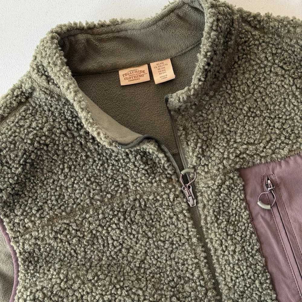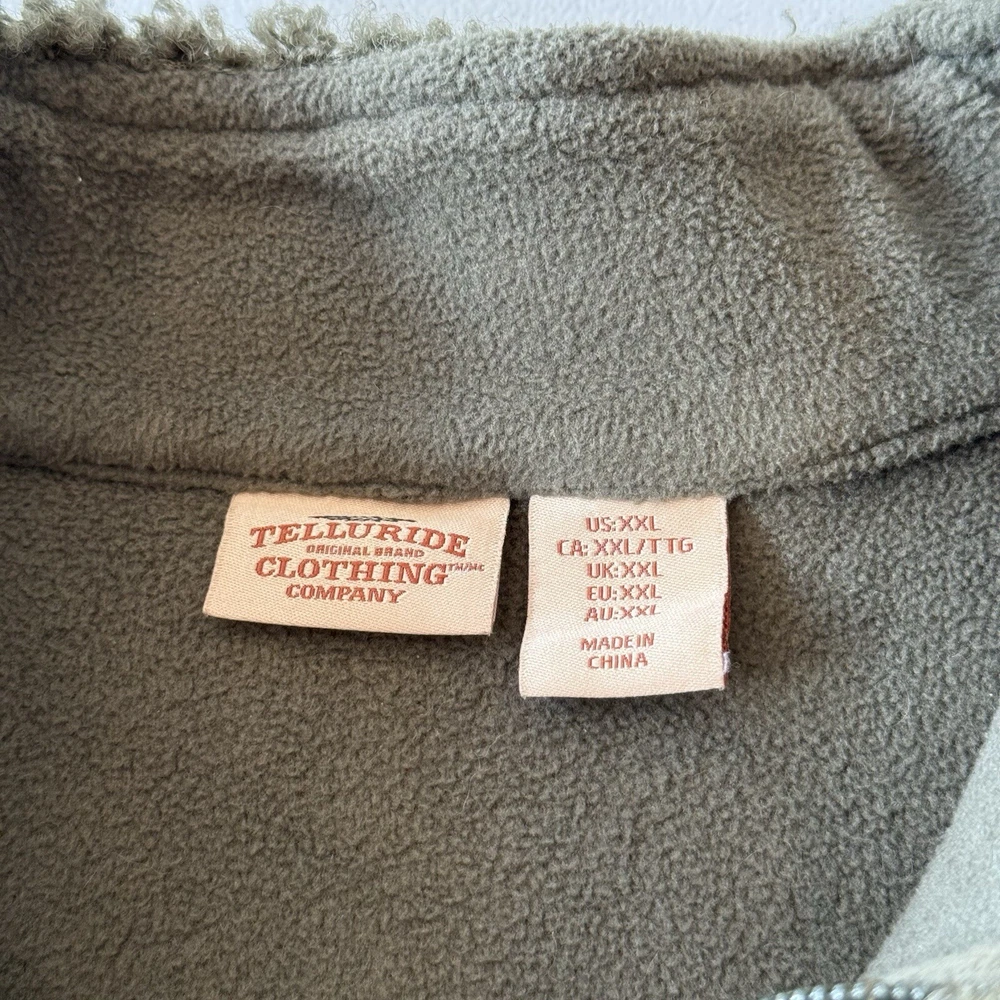 Telluride Clothing Sherpa Fleece Hiking Vest Full Zip 3 Front Zipper Pockets Men’s XXL Olive Green 100% Polyester Pockets: 85% Nylon,15% Spandex Machine Washable Excellent Preloved Condition. Thank You For Viewing My Listing! Item Cleaned According To EBay’s Standards. RETURNS: I accept returns on items and will refund buyer on cost of item as long as the item is returned in the same condition as it was originally shipped. Buyer Pays Shipping.