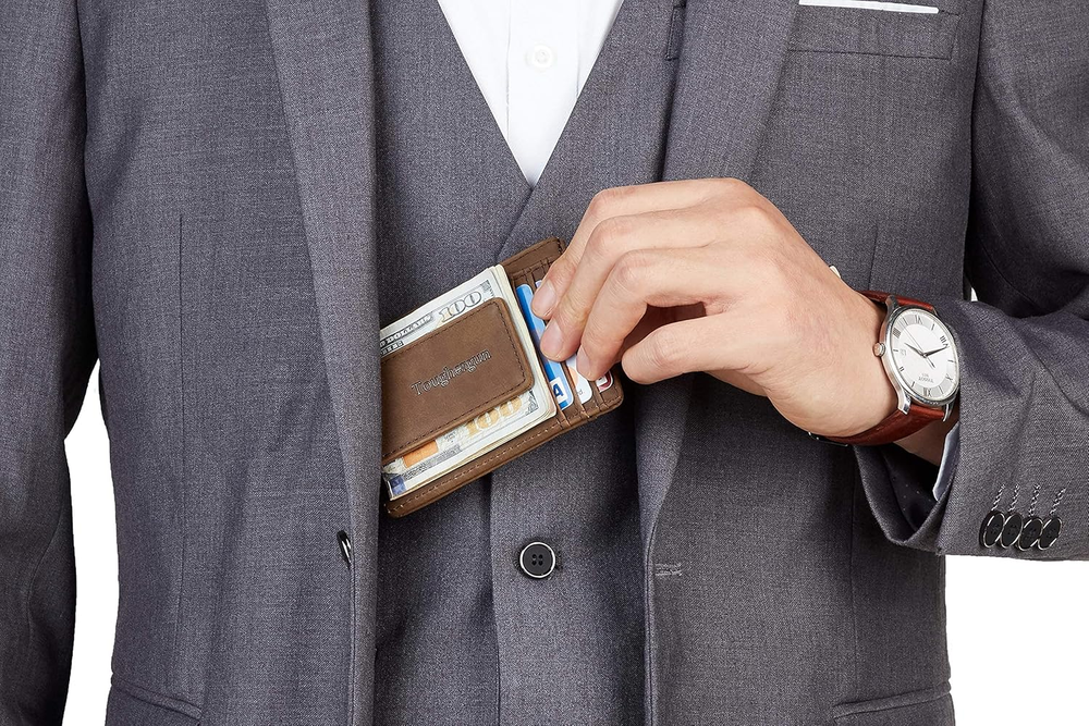 This sleek leather money clip and wallet set is a must-have! The genuine leather feels luxurious and durable, perfect for keeping bills and cards organized. Compact yet spacious, it fits easily in pockets without bulk. The classic design suits any style, making it a great gift or personal accessory. Love the quality and craftsmanship—definitely worth it!