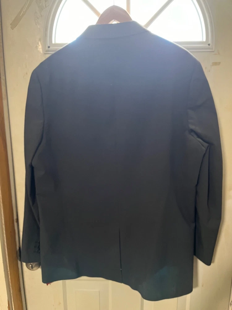 The product is a men's Alfani dress jacket in a size 46/48 XL slim fit stretch, designed in black color. It is a stylish piece ideal for formal occasions or professional settings. The Alfani brand is known for quality and modern designs, .