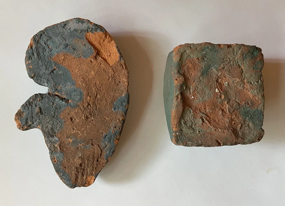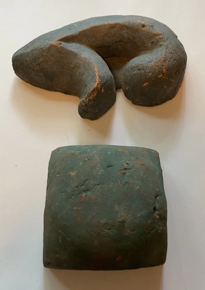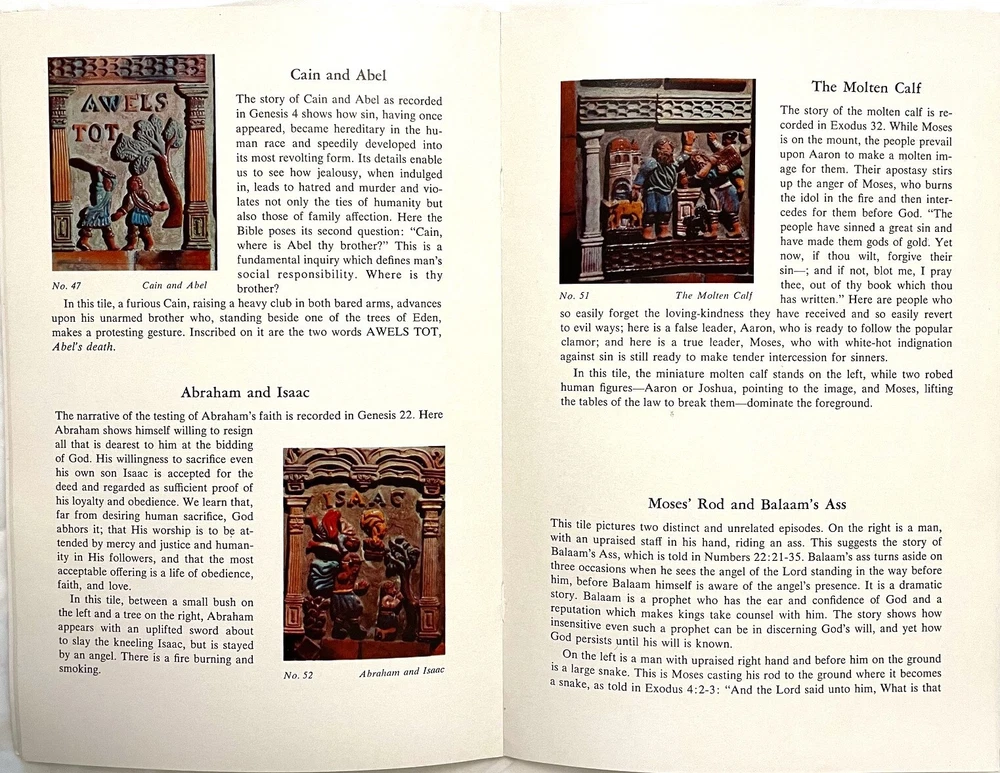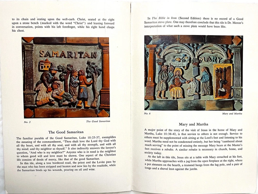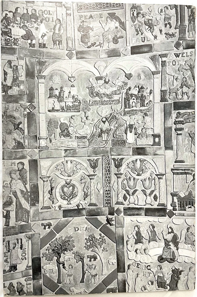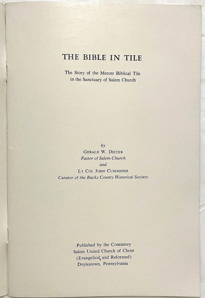 Mercer Moravian Pottery Architectural Decorations Pre-1930 period (Mercer Lifetime) These are not modern reproductions. They were produced during Henry Chapman Mercer's lifetime. Examples of these architectural design elements are seen throughout the interiors of the Mercer Museum and Fonthill (Mercer’s home) in Doylestown, PA. Not glazed. Square element: 2 ½” L x 2 ½” W x 1 ½” H. Plant element: 4 ¾” L x 3” W x 1” H. Condition: Very good. Chips on back of plant element. Includes bonus book: " The Bible in Tile" by Gerald W. Dieter and John S. Cummings, 1957. Record of the unique Mercer tile church chancel walls illustrating Bible stories, based on Moravian iron stove plate designs. Examples of architectural elements in tile See photos Henry Chapman Mercer (1856-1930) began producing decorative tiles Works in Doylestown, Bucks County, Pennsylvania in a style based on Moravian German settlers’ design motifs for their cast iron stove plates. Between 1911 and 1912 Mercer built the present Moravian Pottery and Tile Works (MPTW) to “master the potter’s art and establish pottery under personal control.” MPTW continued operation after Mercer's death in 1930 until sometime in the 1950s. Reproductions of Mercer's original designs were introduced by the Bucks County Department of Parks and Recreation in 1976 Mercer generally did not affix a potter's mark to tiles made while he directed the work. Following his death, there were several marks used to indicate that a tile had originated at MPTW. When the Bucks County Department of Parks and Recreation took over the MPTW as a working museum, all tiles made by the museum were impressed on the obverse with a stylized "MOR," and the year of manufacture.