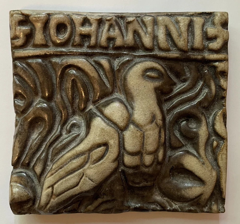 Mercer Moravian Pottery & Tile Works-St. John the Evangelist Tile (Eagle Symbol) The eagle is the symbol of St. John the Evangelist. Glazed. 4 ¾”.x 4 1/2" Condition: Superb. With the backstamp of the Moravian Pottery & Tile Works, dated 1988. Henry Chapman Mercer (1856-1930) began producing decorative tiles Works in Doylestown, Bucks County, Pennsylvania in a style based on Moravian German settlers’ design motifs for their cast iron stove plates. Between 1911 and 1912 Mercer built the present Moravian Pottery and Tile Works (MPTW) to “master the potter’s art and establish pottery under personal control.” MPTW continued operation after Mercer's death in 1930 until sometime in the 1950s. Reproductions of Mercer's original designs were introduced by the Bucks County Department of Parks and Recreation in 1976 Mercer generally did not affix a potter's mark to tiles made while he directed the work. Following his death, there were several marks used to indicate that a tile had originated at MPTW. When the Bucks County Department of Parks and Recreation took over the MPTW as a working museum, all tiles made by the museum were impressed on the obverse with a stylized "MOR," and the year of manufacture.