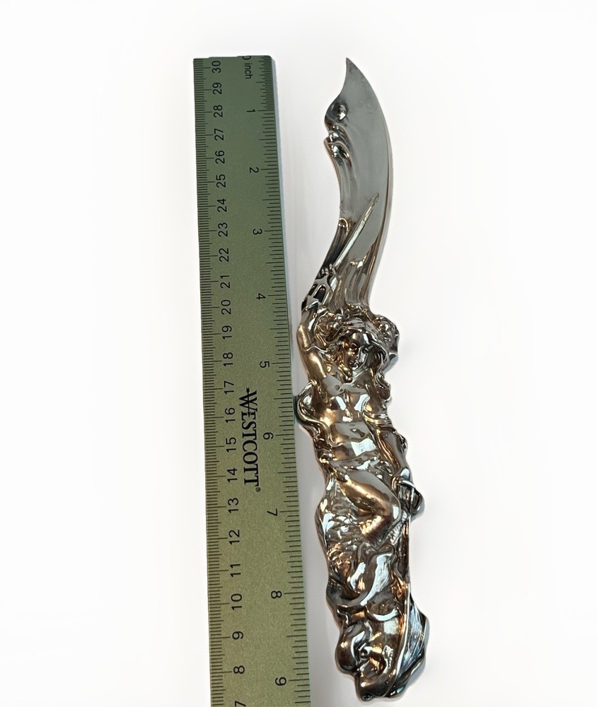 The Mermaid Silver Letter Opener is a vintage piece inspired by the Art Deco Nouveau style, making it a unique and elegant addition to any desk set. This letter opener features intricate detailing and a striking design that is sure to catch the eye. Perfect for those who appreciate the beauty of artistry and the charm of a bygone era, this piece is a true collectible item that will stand out in any collection. In excellent condition.
