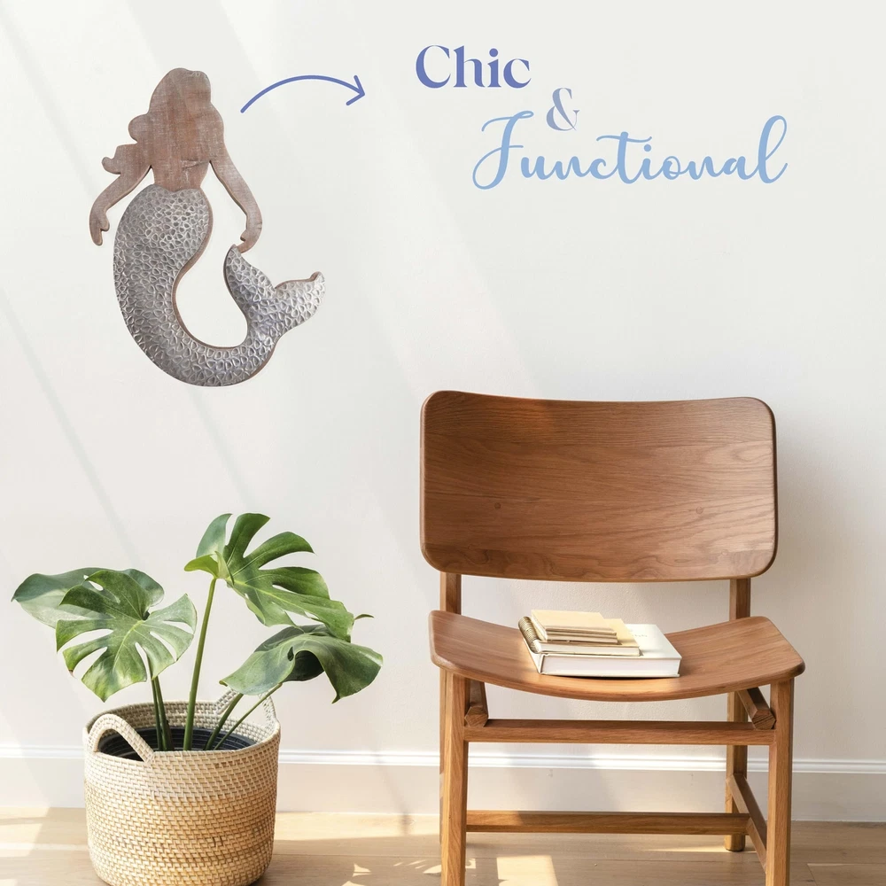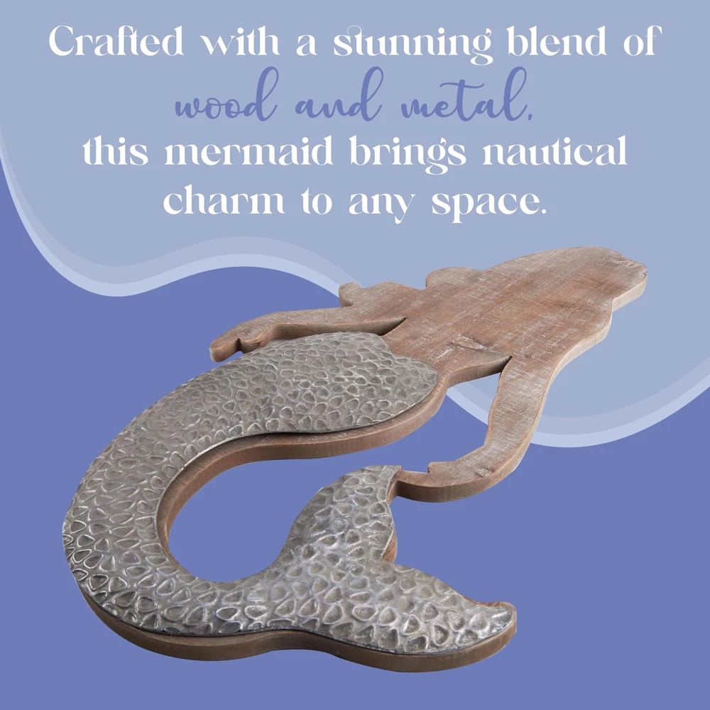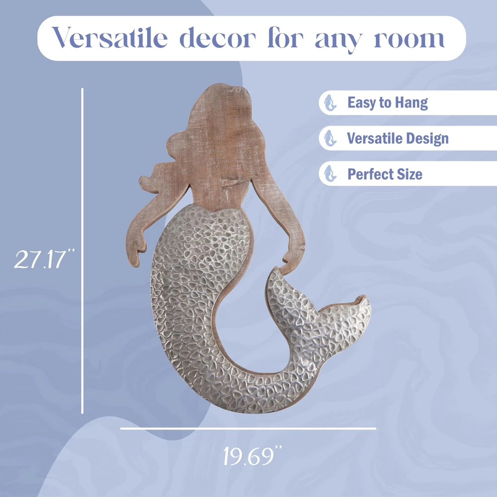 "Bring a coastal, yet chic look to your home with the Metal and Wood Mermaid Wall Decor. This exquisite piece features a wooden mermaid with elegant metal details on the tail, crafted to bring a nautical charm to your space. The neutral tones of the mermaid wall decor ensure it blends seamlessly with any wall color, making it a versatile addition to various decor styles, including modern, rustic, and nautical-themed interiors. Ideal for enhancing the decor of kitchens, living rooms, bedrooms, and beach houses, this mermaid wall decor serves as a stunning focal point. It is easy to hang with a built-in hook, allowing for quick and hassle-free installation. Embrace the beauty of the coast with this unique mermaid wall art, perfect for coastal homes and ocean-inspired interiors. like wall hangings, metal wall art, and gallery walls not only enhance the aesthetic appeal of a space but also make it feel more inviting and lived-in. This mermaid wall decor, with its coastal and nautical theme, adds a touch of and charm, making any room feel like a cozy retreat. Perfect for personalizing your space, wall decor helps in setting the tone of your home, creating an inviting and comfortable atmosphere for family and guests alike."