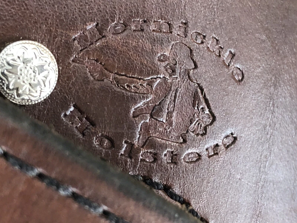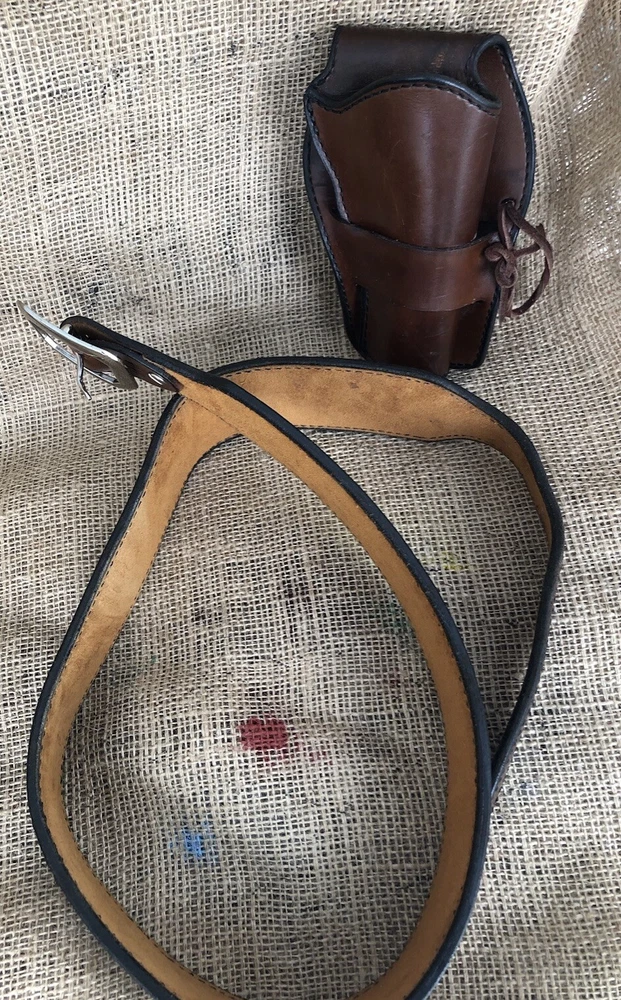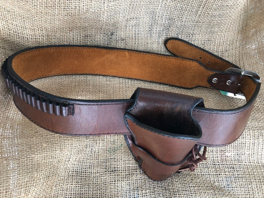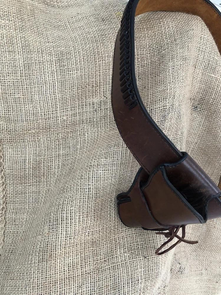 This is a Mernickle Holsters genuine leather belt and holster rig designed in a Western style for carrying a revolver on the hip. It is specifically made for shooting activities and features a belt attachment for secure carrying. The product is pre-owned, reflecting its previous ownership or use. The holster loops are sized to carry 22 caliber ammunition. The belt size is 44 inches. The holster and ammunition is designed for a revolver long gun.