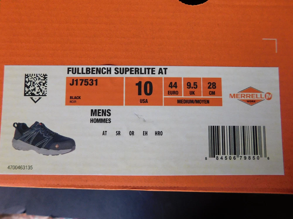 Merrell - Full Bench Superlite Alloy-Toe Work Shoe Color: Black Size: 10M · FEATURES • Mesh and synthetic upper • Traditional lace closure • Metallic hardware • Protective and abrasion resistant synthetic toe cap • Breathable mesh lining • Kinetic Fit™ Base • Molded nylon arch shank for mid-foot support and flexibility • Alloy Toe protection; rated ASTM F2413-18 I/C • EH rated ASTM F2413-18 • Oil and slip resistant rubber out-sole; Mark II tested • EVA mid-sole in conjunction with M Select Grip targeted out-sole pods for ultralight comfort under foot • Merrell M Select™ GRIP rubber tunes each out-sole with durable traction that grips when and where you need it List: $95.00 I am recently new to eBay, but I am fully committed to providing quality products. I inspect everything. If there is,or were to be, some issue with an item, it would be duly noted. As a customer myself, I like to know what I am buying is what I am buying. I provide expedient shipment, double-box all shoes, while securely packaging all other product for their respective shipment needs. I also strive to provide as much product information that I can verify, with consistency in service. I want happy & repeat customers. I have to start somewhere, sometime! Thank You in Advance - maracu
