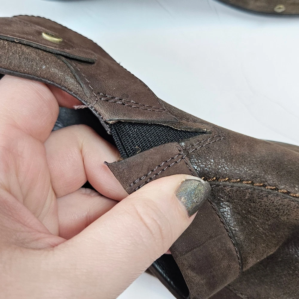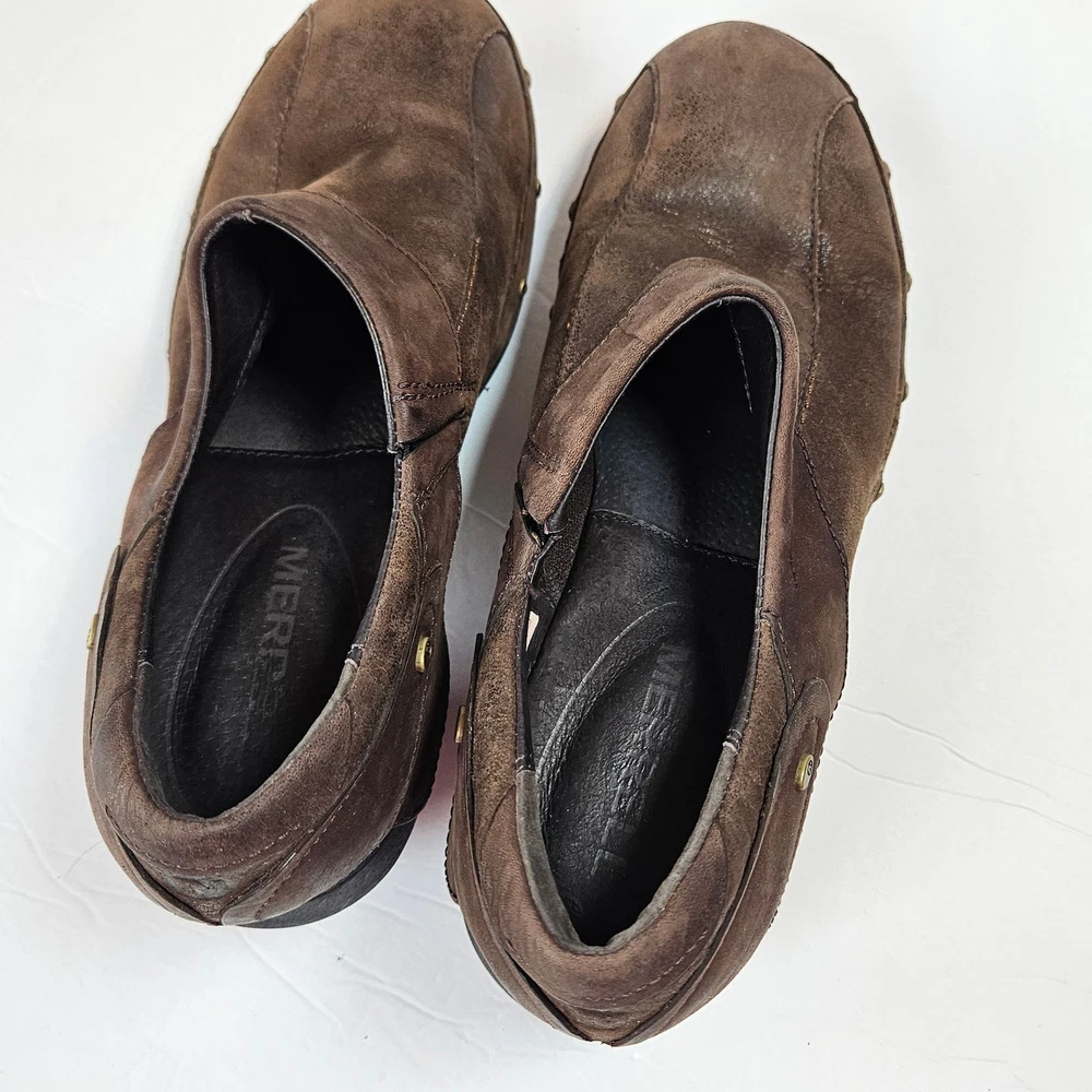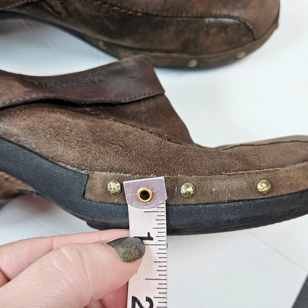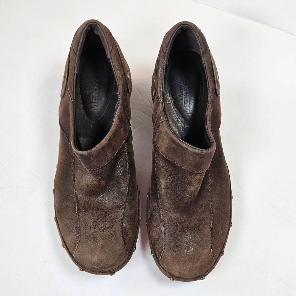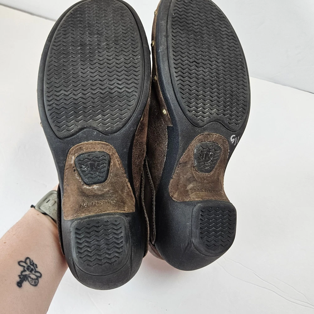 Merrell Luxe Wrap Espresso Brown Leather Clogs Studded J68680 Women 8 Slip on Rubber heel Clog Studded detail Uppers: Leather Balance: Manmade j68680 Women's 8 UK 5.5 EUR 38.5 Heel is about 2" casual everyday comfort unique business professional aesthetic edgy walking neutral cottage cabin outdoor earth tone Excellent pre-owned condition, no rips, tears or stains. Smoke free, dog friendly home.