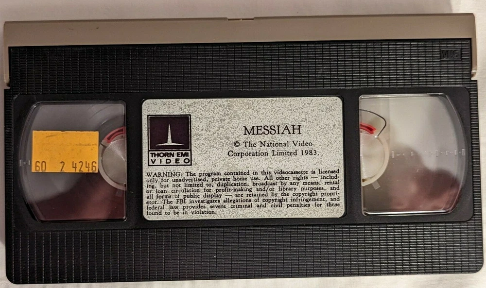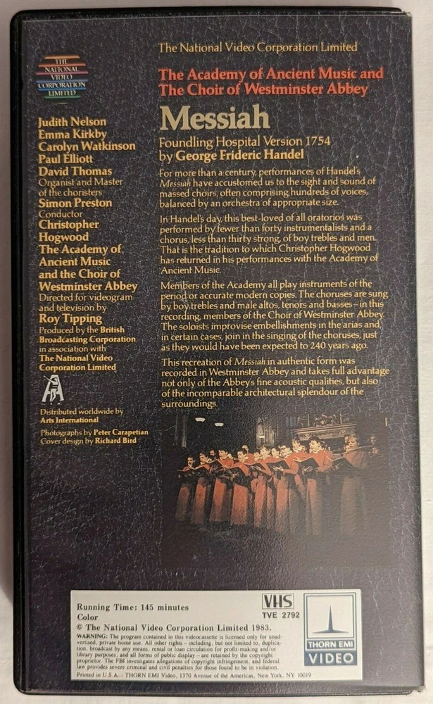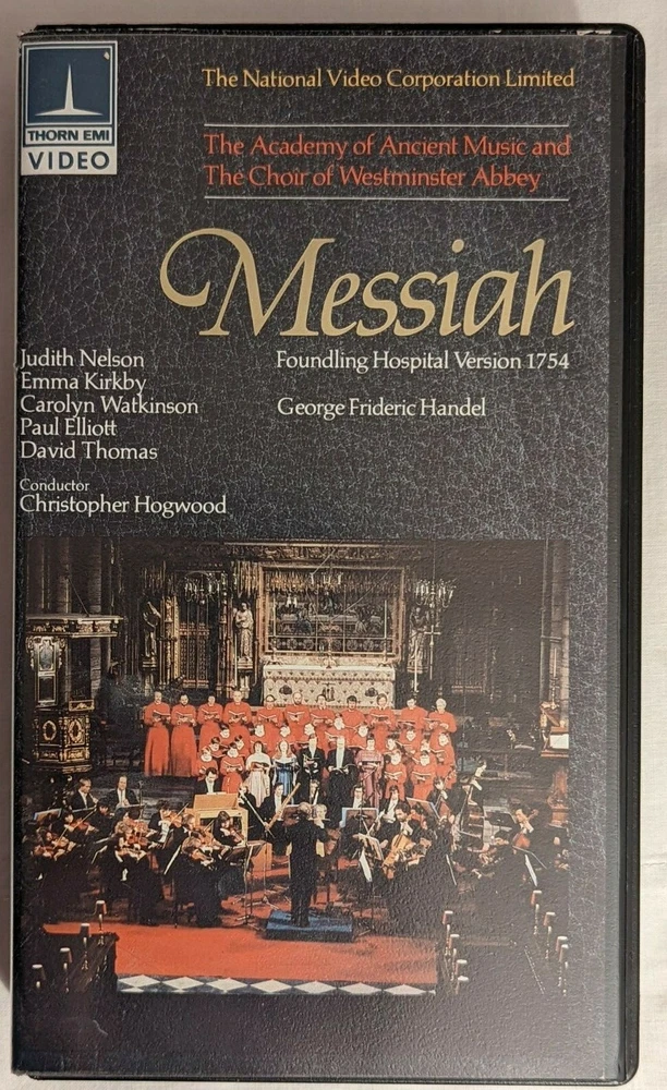 The Academy of Ancient Music and The Choir of Westminster Abbey George Frederic Handel's Messiah (VHS). Founding Hospital Version 1754. Featuring Judith Nelson, Emma Kirkby, Carolyn Watkinson, Paul Elliott, and David Thomas. Christopher Hogwood conducting. From the back cover: For more than a century, performances of Handel's Messiah have accustomed us to the sight and sound of massed choirs, often comprising hundreds of voices, balanced by an orchestra of appropriate size. In Handel's day, this best-loved of all oratorios was performed by fewer than forty instrumentalists and a chorus, less than thirty strong, of boy trebles and men. That is the tradition to which Christopher Hogwood has returned in his performances with the Academy of Ancient Music. Members of the Academy all play instruments of the period or accurate modern copies. The choruses are sung by boy trebles and male altos, tenors and basses - in this recording, members of the Choir of Westminster Abbey. The soloists improvise embellishments in the arias and in certain cases, join in the singing of the choruses, just as they would have been expected to 240 years ago. This recreation of Messiah in authentic form was recorded in Westminster Abbey and takes full advantage not only of the Abbey's fine acoustic qualities, but also of the incomparable architectural splendour of the surroundings. Includes booklet which has some damage and writing. Please do not hesitate to contact me with any questions or comments. Thanks!