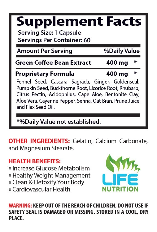 Green Coffee Bean Extract Cleanse 800mg New Extra Strength Formula Best Weight Loss Supplements Increase Glucose Metabolism, Healthy Weight Management Clean And Detoxify Your Body, Cardiovascular Health, Appetite Suppressant, Fat Burner. 2 Bottles, 120 Capsules Made In USA What are Green Coffee Beans? Health Benefits of Green Coffee Beans Green Coffee Bean Extract is derived from raw or unroasted coffee beans. Supplements based on this extract have become popular in recent years since researchers have discovered that they contain many beneficial components. In particular, the extract from green coffee beans contains chlorogenic acid, quinides, lignans, and trigonelline which make it a great home remedy for many health conditions. The roasted and brewed coffee beans that we're usually familiar with do not serve the same health benefits since the cleaning, drying, roasting and brewing processes destroy many of their medicinal components. Benefit Of Green Coffee Bean Extract Cleanse: A major benefit of green coffee bean extract cleanse that is derived from this natural extract is the process of weight loss and fat burning. There is a compound known as chlorogenic acid that has been found in green coffee bean extract, which allows your body to regulate glucose levels, and also speed up your metabolism. Inside Green Coffee Bean Extract Cleanse is 45% standardized chlorogenic acid! This simple process in turn makes for you the perfect natural fat burner to become available. That is refers to this extract as a “miracle fat blaster” and recommends it to all who are having a problem with weight loss.What this cleanse can do for you is increase your metabolism effectively, curb your cravings, and provide you with clean energy. Also, as your blood sugars are balanced, you’re detoxifying throughout all of your bodily systems, allowing you a true clean start in getting healthy and staying that way. If you think that this cleanse may be the right step for you. How Does Green Coffee Bean Extract Cleanse Help You Lose Weight? Essentially, the Green Coffee Extract helps you shed fat by: Blocking Fats – The fats blocked are the fats the body cannot use for energy. Absorbing Carbohydrates – The absorbed carbs help your body use the available fats more efficiently. Regulating Blood-Sugar Levels – The regulation of blood sugar helps avoid the extremes some people experience which either cause them to consume more sugar to keep their perceived energy levels up or they experience the “crash” when their sugar drops significantly.The main idea is that you can take these pills before meal to help control and regulate your body’s functions and still eat the diet you are most comfortable to consume.Some people don’t prefer to increase their activity levels or they can’t do so due to their health issues. Weight Loss With Green Coffee Bean Extract Cleanse: Green coffee bean extract is known as the best natural weight loss substance. Green coffee helps in weight loss and boosts metabolism. Chlorogenic acid inhibits the uptake of glucose in the intestines and speed up metabolism of fat in the body. This makes the individual who has excess stored fat to have a large percentage of the fat broken down to provide the necessary glucose required by the body to provide energy. Green coffee has been found to stop deposition of new fat in the body helping you to maintain your slim figure after regular use.The extract is made from raw unroasted coffee beans and is reputed to have plenty of health benefits including in weight loss. When coffee beans are roasted, the process greatly reduces the amount of chlorogenic acid in the coffee. It is this chlorogenic acid which has been found to have significant health benefits including reducing body fat. Enhance Metabolism Process: Coffee Bean extract has the ability to enhance and boost the overall metabolic rate of the human body. Increased metabolic activity has numerous health benefits. The presence of chlorogenic acid boosts metabolism, burning fat and excessive adipose tissue in the body at a faster rate like never before. Surprisingly it has also been discovered that the presence of “kelp” in raw and untreated green coffee bean extracts is a fantastic source of rich vitamins and minerals, which help in keeping the body in good vital condition. Green Coffee bean ideally speeds up metabolism by altering the means in which glucose in blood is absorbed into the body. Is Green Coffee Bean Extract Cleanse Safe? There has not been wide and empirical studies carried out to establish if there are any significant negative effects of taking the extract. Perhaps the best explanation for this paucity in data is that there hasn’t been any reason to carry out such a study. When you come to think of it, since the extract is a purely natural ingredient, there is no need for alarm. However, it is necessary to take normal precautions before taking the supplement, just as you would with any other products in the same class. High Proportion Of Antioxidants In Green Coffee Bean Cleanse: Is a well-known fact that antioxidants play a key role in enhancing the overall body metabolism leading to weight loss. Antioxidants help prevent the oxidation of other food molecules inhibiting the formation of free radicals in the system. It has been discovered that untreated or raw green coffee beans contain very high levels of chlorogenic acid, which is rich in antioxidants. This acid is excellent for enhancing overall health of the body. It has also been observed that antioxidants help in the prevention of life threatening diseases such as cancer, coronary heart disease, and even altitude sicknesses and many more. Supplement Facts Of Green Coffee Bean Extract Cleanse 800mg : Green Coffee Bean Extract 400 mg Proprietary Formula 400 mg: Fennel Seed, Cascara Sagrada, Ginger, Goldenseal,Pumpkin Seed, Buckthorne Root, Licorice Root, Rhubarb, Citrus Pectin, Acidophilus, Cape Aloe, Bentonite Cl