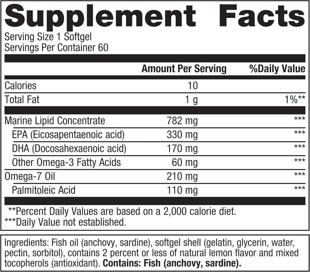 About this item Omega 3 & 7 Fish Oils: OmegaGenics Mega 10 provides 330 mg EPA, 170 mg DHA, and 210 mg Omega-7 per softgel No Fishy Aftertaste: Our fish oil supplement is stabilized with antioxidants for freshness, providing immune support with a natural lemon flavor* Sustainably Sourced EPA DHA: Cold-water fish oil is sourced from fisheries that practice sustainable fishing Non-GMO & Gluten-Free: Our EPA DHA supplement is tested for hundreds of contaminants and is in-house tested to ensure safety and potency Designed by Nature, Trusted by Doctors: At Metagenics, we connect people with products that help them live healthier, happier lives