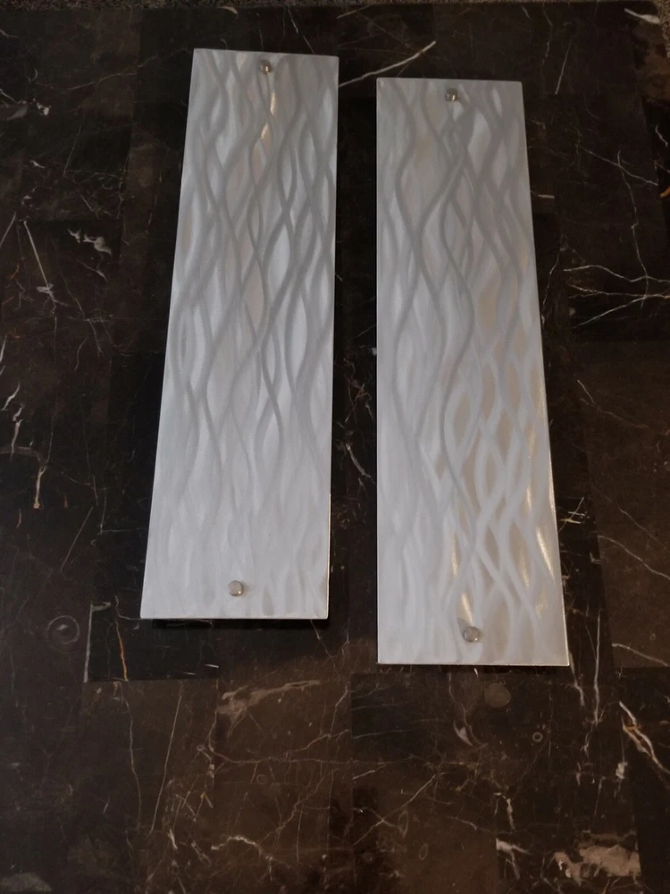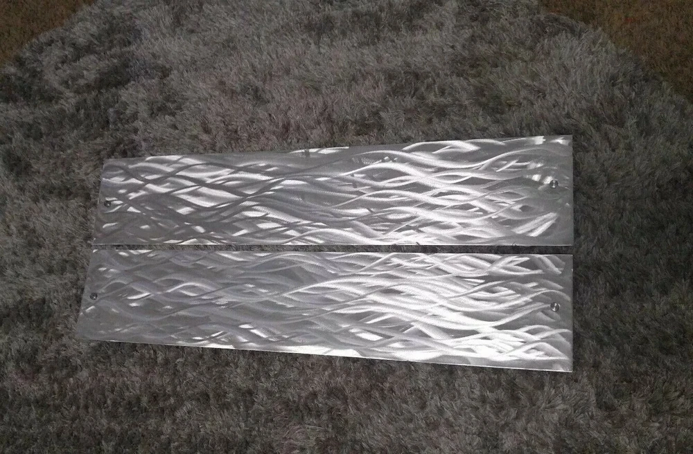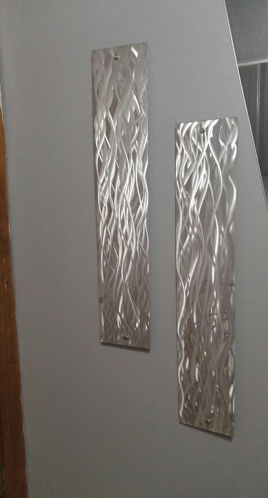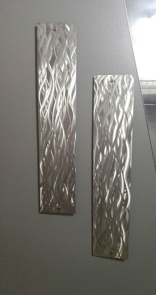 Modern metal wall art silver home decor Each pannel is 24" tall 6" wide set of 2 080 aircraft grade aluminum. Hand cut design original fine art indoor or outdoor wall hanging. Pieces can be hung any way preferred. Can be hung indoors or outdoors. Sits 1" off the wall. Each piece is made to order hand drawn and hand cut original metal art work and sculptures. we can make any design to custom specifications. Everything is made in the USA Twin Falls Idaho. Our shop has two workers we are a husband and wife team that specialize in high end interior and exterior custom art work. >Product Details: >-Stainless steel standoff hardware is included Packed with a thick cardboard wrapped in thick Styrofoam or bubble wrap Easy to clean with a microfiber cloth. If pieces are left outside we recommend using a clear enamel each year to keep the piece protected Does not require special lighting but the more light it has near it the brighter it will shine either sunlight or indoors