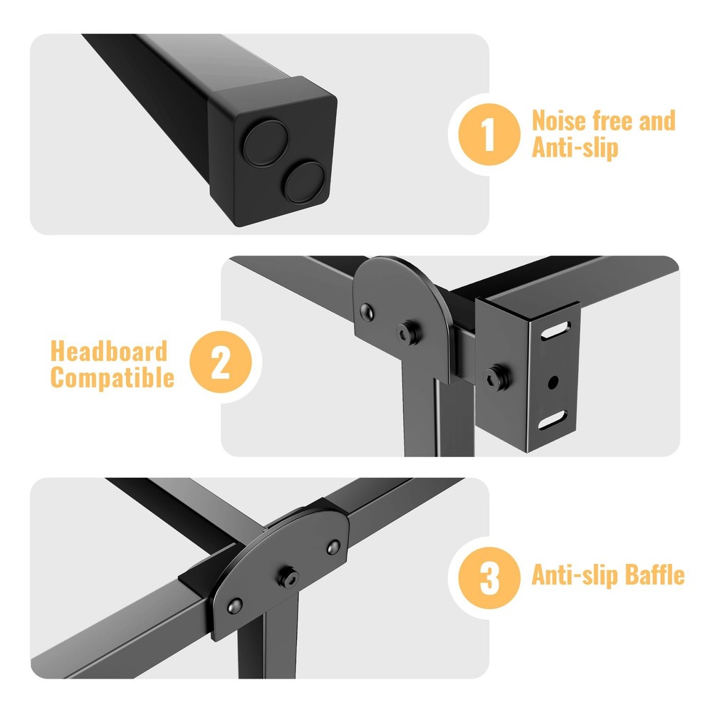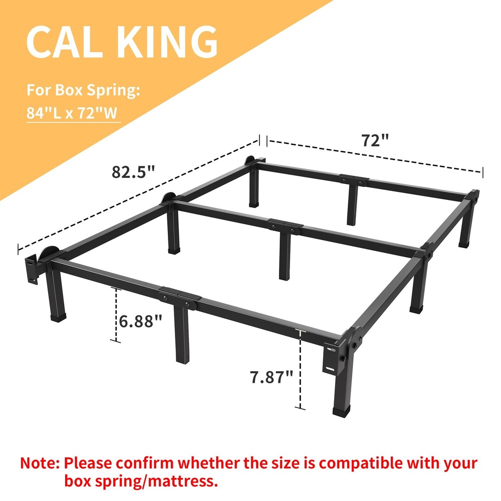 This bed frame bracket is new upgraded to fits most supporting needs for box spring and mattress sets. It is made with strong and dependable steel; and the center support beam can hold your bed box springs & mattress stably and safely. And the headboards holes are ready for you to attach the headboards you like. The foldable brackets of the bed platform makes its assembly and disassemble easier and simpler. We aim to provide exceptional products to our friends on , any suggestions about our products and services are welcome! Box Spring or Bunkie Board required. STURDY SUPPORT - The bed platform base made of solid steel construction provides a stable support for your box spring & mattress; multiple legs and a center beam promise you a long-life use. HEADBOARD COMPATIBLE - This bed frame brackets are designed with 2 slots to attach the bed headboards, you can choice the headboards to match as you like. STORAGE CLEARANCE - 8 inch high legs leave you a somehow under-bed storage space to put your traveling luggage, cartons or little stuffs. EASY ASSEMBLY - All tools and instructions are included for setup. It takes time under 30 minutes. PACKAGE INCLUDES - ONLY the bed frames and accessory needed; a box spring and mattress (NOT included) set is required while using this bed support brackets.