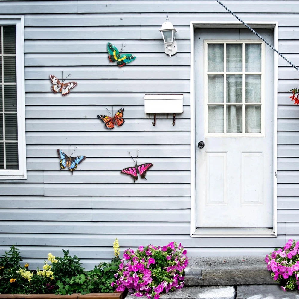 PACKAGE INCLUDE - Set of 5 PCS lifelike metal butterflies with realistic patterns and bright colors that will give you more energy no matter where you decorate. RUST-PROOF - Made of high-quality iron, It is treated with anti-rust technology to make the metal butterfly more durable and keep the color uneasy lost. Make the metal butterfly keeps its beautiful appearance under the sunlight and raining day. EASY TO HANG - There is a keyhole on the back of the butterfly, which can be hung directly on the nail/hook, you can easily hang them on the tree, fence, door or wherever you want. REALISTIC 3D EFFECT - you can fold the wings of the butterfly to stand up, so that the butterfly looks more realistic, and the spring hook design can make the butterfly dance in the wind, It looks more real. WIDELY USED - a great idea for indoor and outdoor decorating, these realistic metal butterflies can be perfect for decorating backyards, fences, gardens, walls, trees, bedrooms, living rooms, TV background walls, walkways, doors or entrances. When you order 3D metal butterfly wall decor today, you have 60 days of protection and no problem money back . There is no risk at all, why not try it?