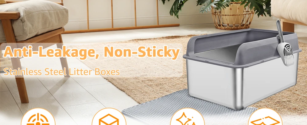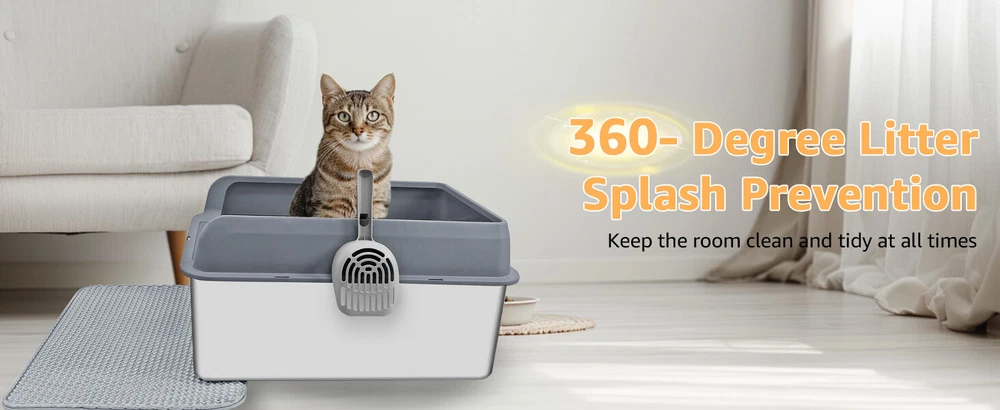 HomeMetal Cat Litter Box Stainless Steel High Sided Open Top with Scoop, XL, Grey