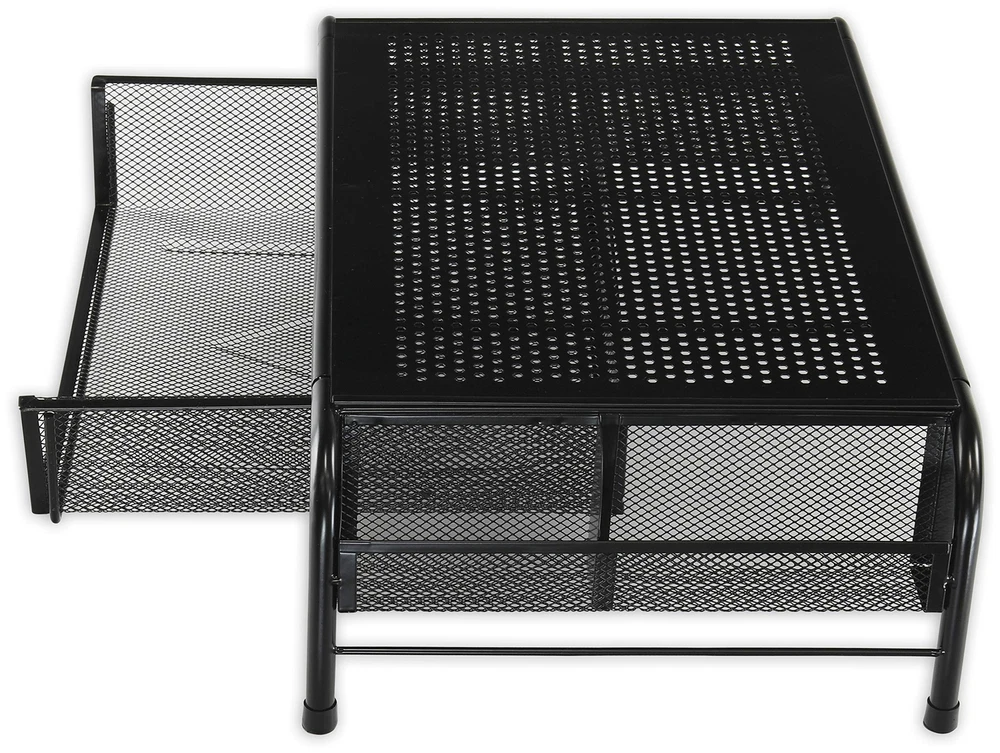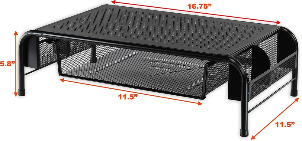 Monitor Riser / Stand for printer, computer, laptop, notebook. Sturdy Metal Construction with Classic Black Coating Raises your monitor to a confortable viewing height. Reduce neck and eye Strain Sliding Drawer Latter Tray holds files and letters. 4 Side Storage Pockets. Two compartments for each side for your ipad, cell phone, calculator, pens and other office supplies. Dimension: 20.25"W x 11.5"D x 5.8"H; USPTO Patent No: USD864211S1