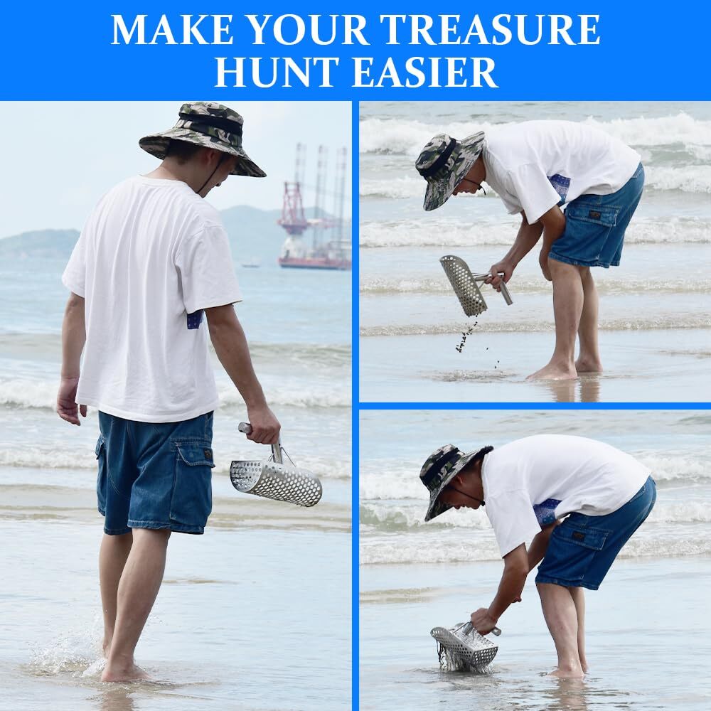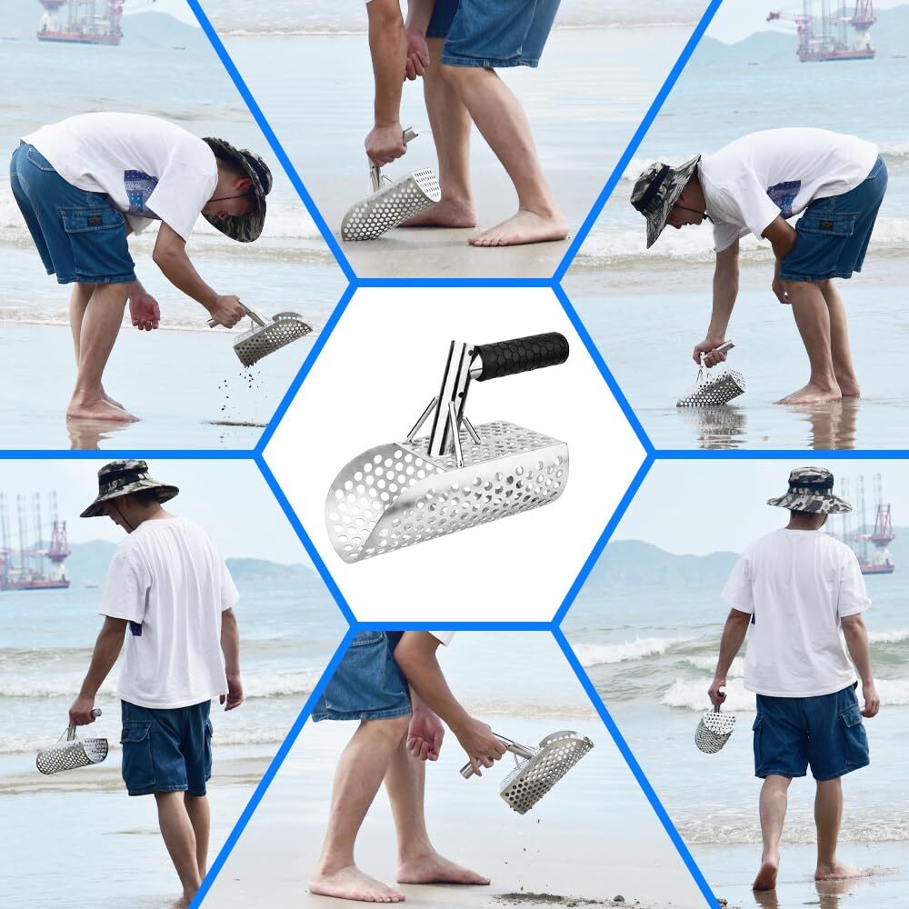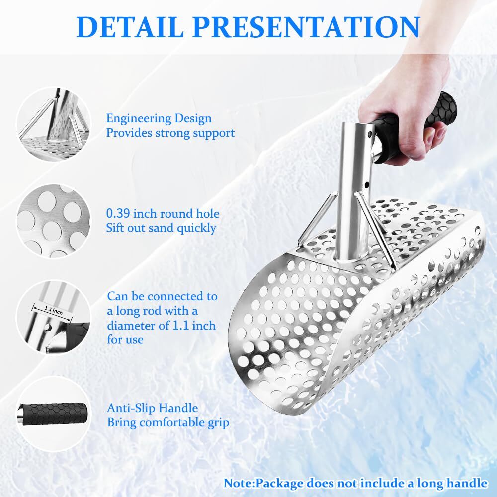 This metal detector sand scoop is made of high-quality stainless steel to ensure robustness and rust protection even in beach environments; Its pointy body curves and pointy rear walls facilitate easier treasure hunting and reduce pressure on hands and feet; The sand scoop measures about 9.8x 7 x 5.1 inches and weighs 1.9 pounds; The 0.39 inch round hole is perfect for sifting sand without losing smaller treasures; The top hole of the handle has an inner diameter of 1.1 inches, allowing you to attach the long handle you like. With a detachable handle equipped with a non-slip rubber handle, our sand shovels ensure comfort during extended use and are ideal for metal detecting enthusiasts hunting for extended periods of time 【Sand Scoop Size】This metal detecting sand scoop measures approximately 9.8x 7 x 5.1 inche with a thickness of 0.07inch and weighs 1.9 lbs 【Stainless Steel Sand Scoop】Our metal detecting scoop is crafted from durable stainless steel, ensuring that it will not rust even with long-term use on the beach. It is sturdy, durable, and perfect for detecting metals in both sand and water 【Optimizing efficiency】No need to use your hands to sift through sand. Our heavy duty sand scoop makes sifting through sand quick and easy. Whenever your metal detector finds buried treasure, simply scoop the sand in the target area, and then shake the scoop from side to side, letting the sand fall through the holes 【Perfect washing ability】 The sand sifter scoop with 0.39 inch cirular holes makes it unnecessary to sift sand through your hands, as the sand easily comes out of the scoop 【Multi-functional Sand Scoop】 Ground conditions: sand with silt or clay, clay and silt clogged sand with shells and stones. Whether you're shoveling sand, panning for gold, or excavating archaeological, this sand scoop can help you quickly sift through items and enhance your efficiency in uncovering valuable finds Tip: For the best care, especially after use in salt water, we recommend rinsing the product with fresh water, drying the item, and then storing it. This simple step helps to extend its life and keep it in tip-top shape for your next adventure