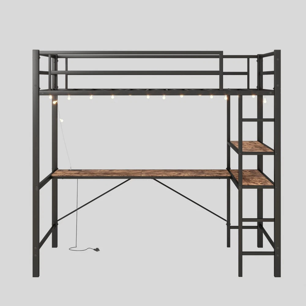 🏠Twin Loft Bed Collection - Space-Saving Solutions for Bedrooms! Discover our versatile line of twin-size loft beds—designed for safety, durability, and maximum space efficiency. Perfect for teens, college students, or small bedrooms, each model combines sturdy construction with functional features to elevate your living space. Choose from basic, desk-equipped, or L-shaped desk + shelf designs to fit your needs. 🖤 Option 1: Metal Twin Loft Bed (Black) - Basic & Sturdy Key Specifications Dimension Type Details Assembled Size 77.95"L x 41.26"W x 50.00"H Product Weight 68.00 lbs Package Dimensions 76.97"L x 16.14"W x 7.68"H Package Weight 68.96 lbs Material Heavy-Duty Metal Weight Capacity Upper Bed: 250 lbs Mattress Requirement Fits Standard Twin Mattress (Not Included) Box Spring Not Required ✨ Standout Features ✅ Ultra-Sturdy Metal Frame : Crafted with heavy-duty metal and 13 secured slats, this loft bed offers exceptional stability and durability—built to withstand daily use for years.✅ Maximum Safety Design : Full-length guardrails on all four sides prevent falls, while the sturdy angled ladder ensures safe, easy climbing up and down.✅ Space-Saving Low Profile : 50” height creates ample under-bed clearance for storage boxes, seating, or a small workspace—ideal for compact bedrooms.✅ Hassle-Free Assembly : All tools, labeled parts, and clear step-by-step instructions included. Assembly takes ~60 minutes (2 people recommended for efficiency). 🖤 Option 2: Twin Metal Loft Bed with Desk, Power Outlet & LED Lights (Black) Key Specifications Dimension Type Details Assembled Size 78.74"L x 41.34"W x 68.50"H Product Weight 84.00 lbs Package Dimensions 78.14"L x 16.53"W x 7.48"H Package Weight 87.97 lbs Material MDF + Heavy-Duty Metal Weight Capacity Upper Bed: 400 lbs Desk: 150 lbs Desk Width 15.15" Under-Bed Clearance 55.1" Guardrail Height 13.19" ✨ Standout Features ✅ All-in-One Work & Sleep Space : Built-in desk transforms the under-bed area into a workstation or reading nook—perfect for students or remote workers.✅ Built-in Power Station : Desk features 2 AC outlets + 2 USB ports for easy charging of laptops, phones, or tablets—no more searching for wall sockets.✅ Customizable LED Lighting : DIY color modes and easy controls create a warm, personalized bedroom atmosphere—great for studying or relaxing.✅ Dual Staircases : Left and right ladders offer flexible placement—fit the bed in any corner of your room without sacrificing accessibility.✅ Superior Safety : Round tube metal frame enhances stability, while 13.19” high guardrails keep sleepers secure. Mattress surface recommended to be 5” below guardrail top (for added safety).✅ Quick Assembly : Labeled parts, tools, and instructions included. Assembled by 2 people in ~40 minutes. 🟤 Option 3: Twin Loft Bed with L-Shaped Desk, Shelves & Charging Station (Brown Wood Finish) Key Specifications Dimension Type Details Assembled Size 77.95"L x 41.34"W x 72.05"H Product Weight 101.50 lbs Package Dimensions 79.72"L x 16.34"W x 7.86"H Package Weight 102.70 lbs Material MDF + Heavy-Duty Steel Weight Capacity Upper Bed: 400 lbs Under-Bed Clearance 59.46" Guardrail Height 12.59" ✨ Standout Features ✅ L-Shaped Desk & Shelves : Spacious work surface + built-in shelves provide ample storage and workspace—ideal for books, decor, or office supplies.✅ Premium Charging Station : Desk includes 1 Type-C port, 2 USB ports, and 2 AC outlets—charge all your devices simultaneously.✅ Noise-Free Design : Sturdy metal slats distribute weight evenly, eliminating wobbling and squeaks for a peaceful night’s sleep.✅ Heavy-Duty Steel Frame : Square metal tubes and heavy-duty screws ensure long-lasting stability and rust resistance—easy to clean and maintain.✅ Enhanced Safety : 12.59” heightened full-length guardrails prevent falls, while the sturdy ladder offers secure climbing.✅ Max Space Efficiency : 59.46” under-bed clearance maximizes vertical space—use for storage, seating, or extra living area. 🛡️ Unbeatable Customer Protection (All Models) 1-Year Quality Warranty : We stand behind our loft beds! Enjoy a 12-month warranty against manufacturing defects (e.g., broken metal frames, faulty hardware, or damaged desk surfaces). 30-Day Free Return Policy : Not satisfied with your purchase? Return the loft bed within 30 days for a full refund—no questions asked. Reliable Customer Support : Have assembly questions or need replacement parts? Our dedicated team responds quickly to all inquiries. If parts are missing or damaged during shipping, contact us immediately for free replacements. 🌍 Quality Crafted in China Each loft bed is manufactured with strict quality control standards, combining durable materials with expert craftsmanship. Whether you’re furnishing a teen’s bedroom, a college dorm, or a small apartment, these beds offer unbeatable value, style, and functionality. 🌟 Why Choose Our Loft Beds? No Box Spring Needed : Save money and space—all models support mattresses directly (twin-size, not included). Space-Saving Design : Free up floor space for storage, seating, or work areas—perfect for small living spaces. Versatile Styles : From basic to fully-loaded with desks and charging stations, there’s a model to fit every lifestyle and budget. Upgrade your bedroom with a loft bed that’s as practical as it is stylish. Whether you need a simple bed frame or a complete work-sleep solution, our collection has you covered. Order today and transform your space!