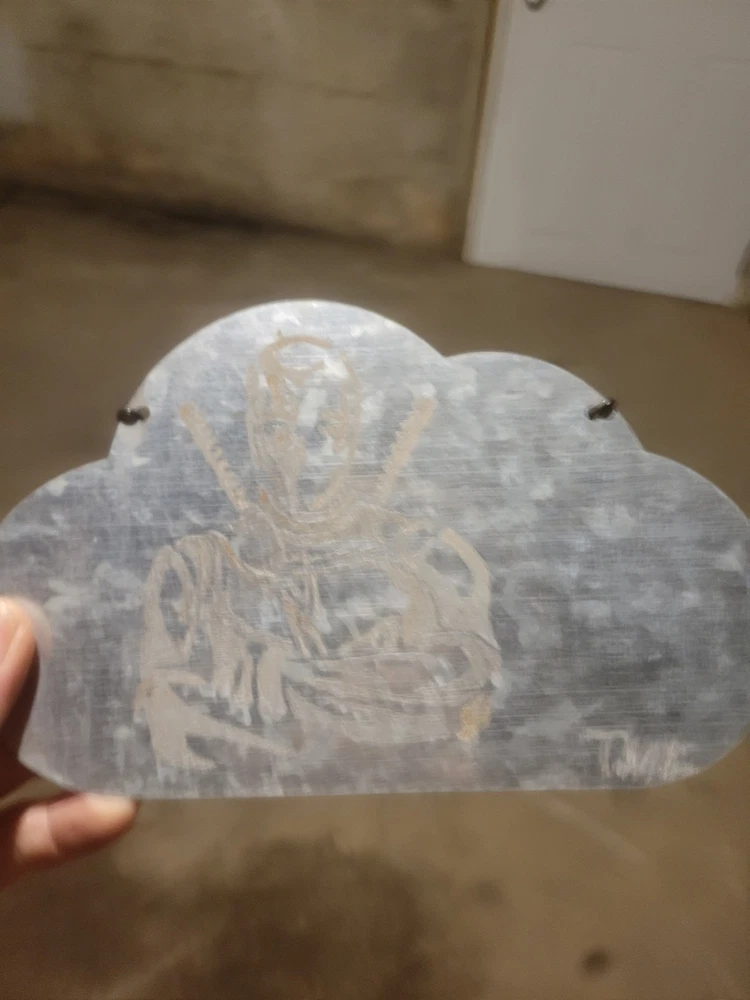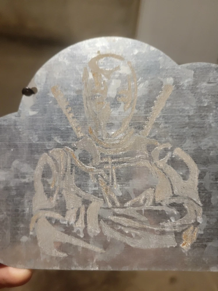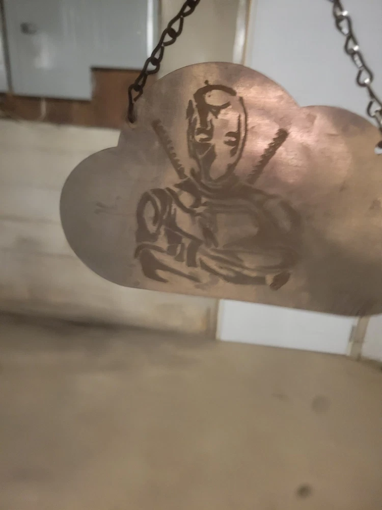 The "Metal Engraved Deadpool Sign" is a handmade slightly weathered metal sign featuring an engraved design of the popular character Deadpool. The sign has a slightly weathered finish, adding to its rustic charm. Perfect for fans of the Deadpool franchise, this collectible piece would make a unique and eye-catching addition to any space.