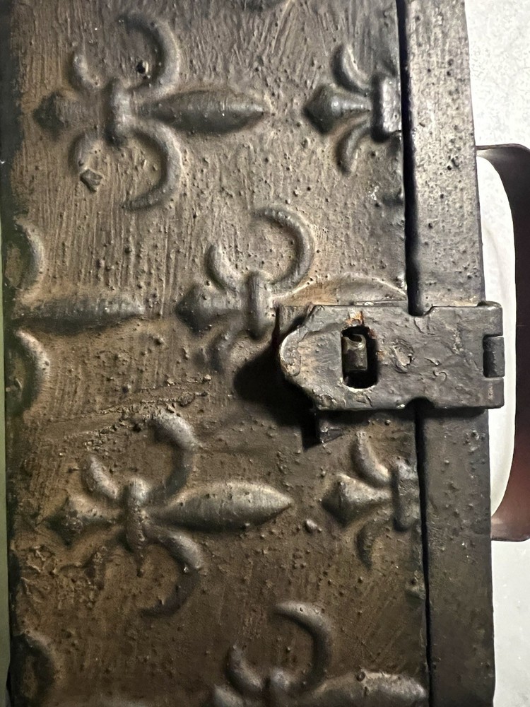 The Metal Fleur-de-lis Container Box is a decorative and functional storage piece suitable for any room. Made of metal with a fleur-de-lis design, this original keepsake box from the late 20th century is perfect for all occasions. Easy to clean with a damp cloth, this box is a stylish addition to any space looking for a unique and elegant way to store keepsakes or small items. Its classic design and versatile use make it a timeless choice for those in need of a contemporary yet vintage-inspired storage solution.