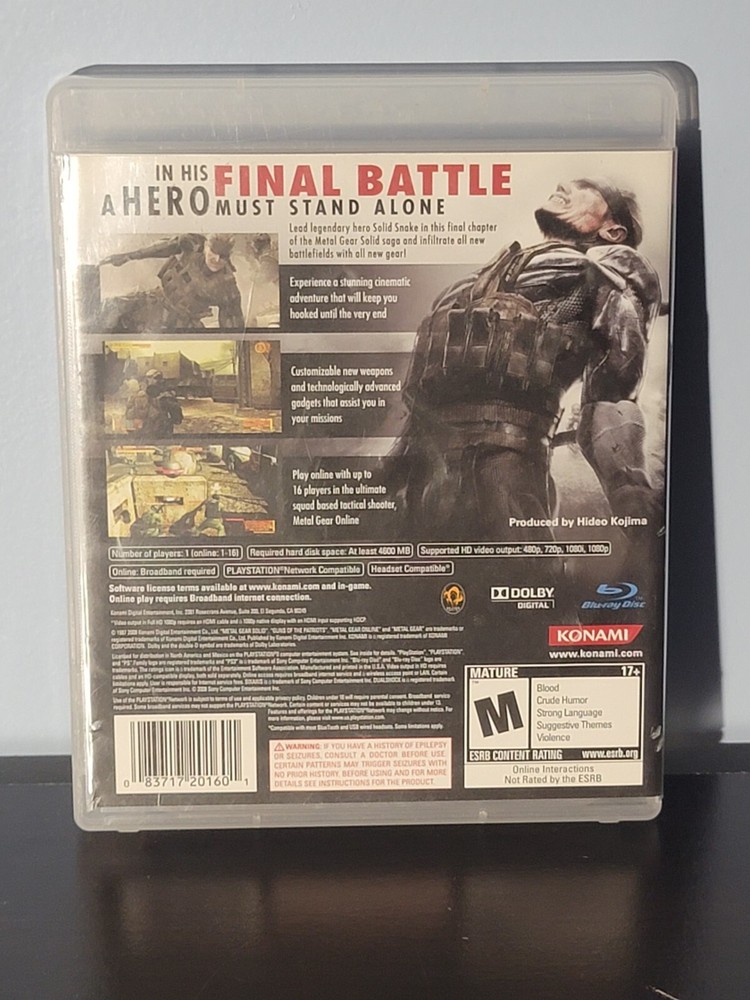 Video Game Series:Metal Gear SeriesRelease Year:2008Publisher:KonamiRating:M - MatureMPN:6RU5HLPNRQCKGame Name:Metal Gear Solid 4: Guns of the Patriotsgtin13:0083717201601UPC:0083717201601Genre:Action & AdventurePlatform:Sony PlayStation 3Features:Travel to the Middle East, South America, and other international locales while tracking the evil Liquid Ocelot Use new gadgets like the "Solid Eye" and "OctoCamo" suit to avoid detection from armed guards Features online supp