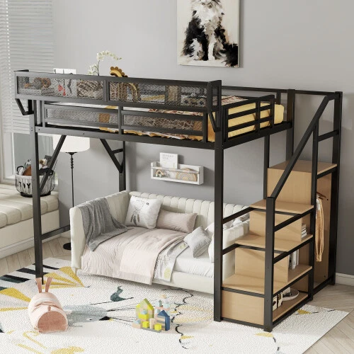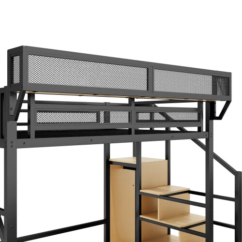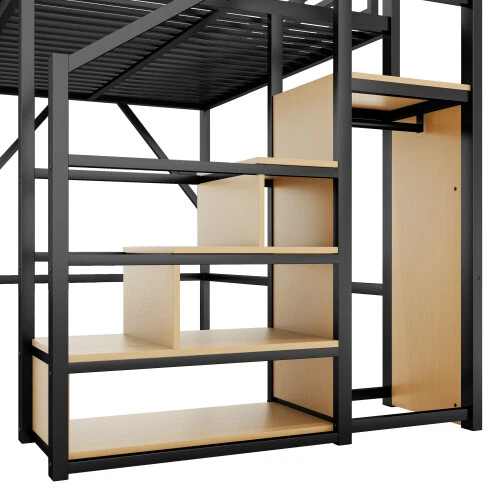 Metal High Loft Bed with Wardrobe Stairs Storage Shelf Full Queen Size Bed Frame [Loft Bed with Storage Shelves for Upper] The full/queen metal loft bed features a storage shelf next to the upper bed, providing extra storage space. This shelf is perfect for keeping books, gadgets, or small items within easy reach. The shelf have mesh around which prevent thing falling down. It adds functionality without compromising space. [Metal Loft Bed with Staircase] The metal full/queen size loft bed come with staircase includes built-in storage compartments, making it easy to store items like shoes, toys, or blankets. The steps ensure safe and convenient access to the upper bed, enhancing both practicality and safety. [Under Space of Metal Loft Bed] 54.3 inch under the full/queen loft bed creates extra space for multi-functional use. You can place storage cabinets, a small sofa, or a desk underneath, maximizing the use of limited space and creating a versatile living area. [Metal Loft Bed with Wardrobe] The staircase features a built-in wardrobe function, providing additional storage for clothes and accessories. This clever design adds more functionality to the metal queen loft bed, making it a perfect solution for small bedrooms. [Durable and Sturdy Construction] The full/queen size metal loft bed made from high-quality metal, this loft bed is durable and sturdy. The metal material ensures long-lasting use and stability, while also offering a sleek and modern look that fits well in any bedroom. Color: Black Material: Metal Overall Dimensions: Full:94.3” x 57.2”x 73.4” (L x W x H). Queen:99.4” x 63.4”x 73.4” (L x W x H). Size: Full/Queen Size Height of Upper Guardrail: 11.3" Clearance Under the Bed 54.3" Recommended Mattress Thickness 6”(not included) Weight Capacity: Full:350LBS; Queen:400LBS. Box Spring Required No Country of Origin China