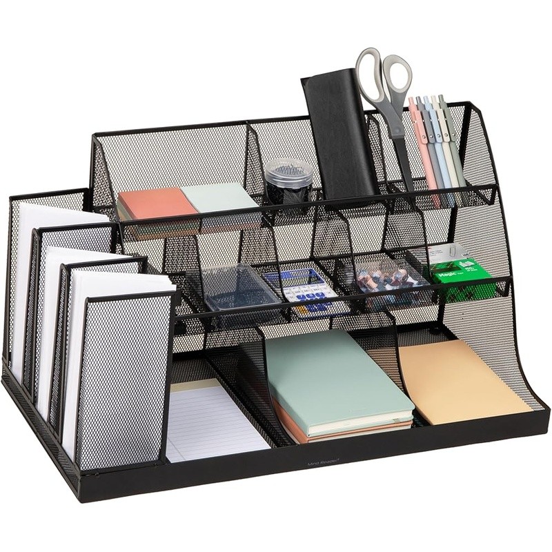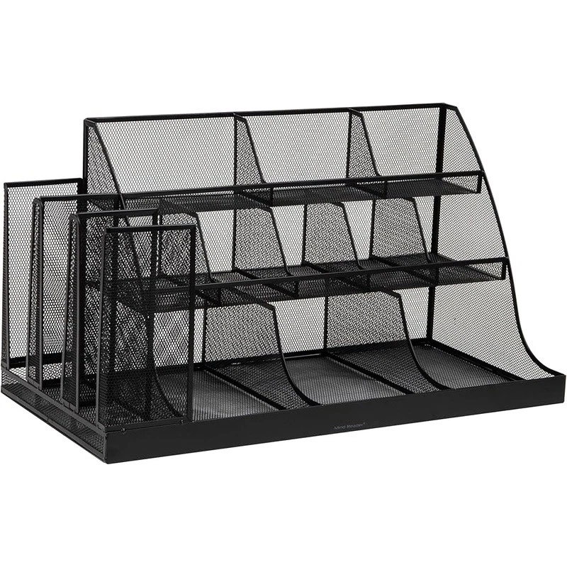 About this item Metal Multipurpose storage: Organizes cups, utensils, napkins, and office supplies in 14 accessible compartments Ideal for office breakrooms: Keeps shared spaces neat and stocked with everyday essentials Durable mesh design: Sturdy metal mesh construction stands up to frequent use in busy environments No assembly required: Arrives ready to use with non-slip rubber grips to keep it stable on any surface Dimensions: Measures 23.75 inches long x 11.5 inches wide x 12.5 inches tall (60.33 x 29.21 x 31.75 cm) and weighs 13.42 lbs (6.08 kg) › Specific Uses For Product: Coffee Bar, Kitchen, Hotel Lobbies, Breakrooms, Hospitality Suites, Restaurants, Office Receptions Material: Metal Special Feature: Condiment Organizer Color: Black Metal Brand: Finish Type: Brushed Product Dimensions: 23.75"D x 11.5"W x 12.5"H Shape: Rectangular Customer Package Type: Standard Packaging Number of Items: 1