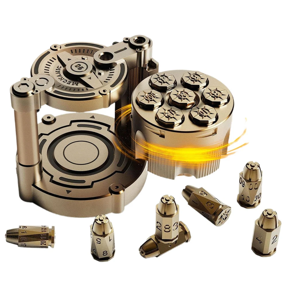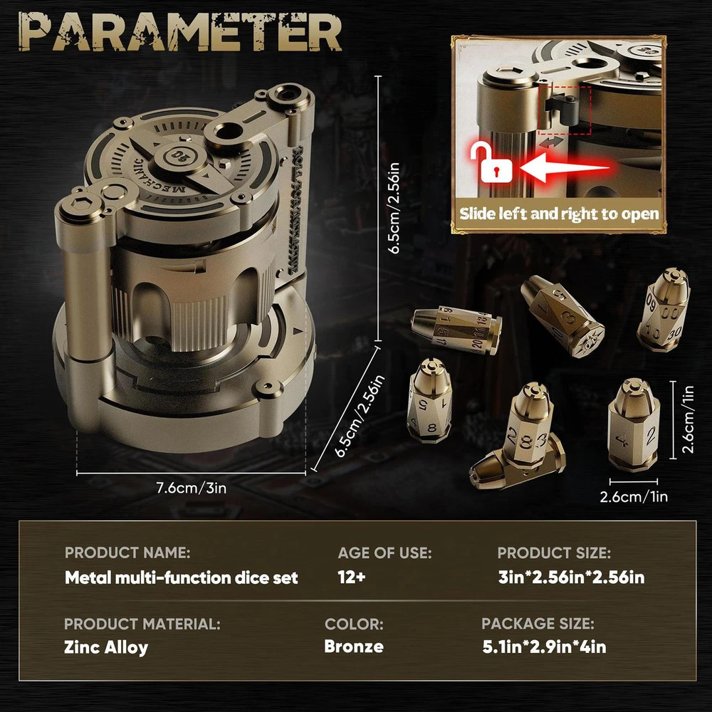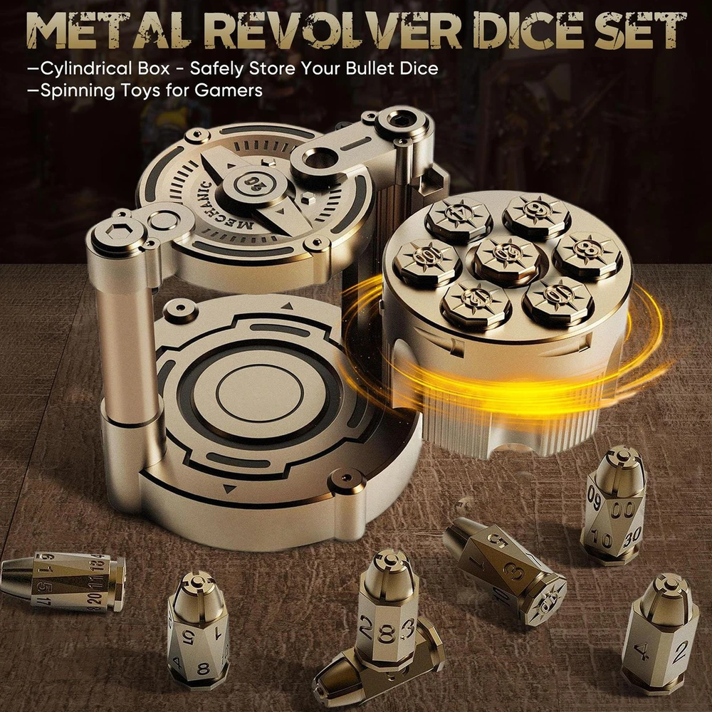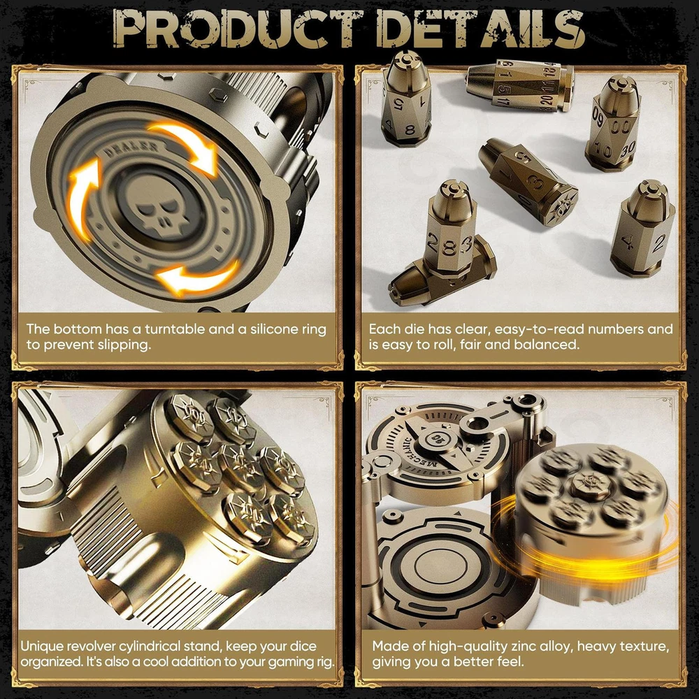 Metal Polyhedral Bullet Dice Set of 7 with Spinning Revolver Cylinder Product Description Bullet Points: Excellent Quality: Thanks to their solid metal material and excellent craftsmanship, our polyhedral dice deliver unrivaled performance and excellent hand feel. The durable and heavy build provides a new accuracy and control, enhancing the overall game experience Excellent Quality: Improve your game experience with our precision-crafted metal polyhedral dice that offer a unique blend of art and practicality. Our excellent design not only evokes excitement but also has a certain collection value, great for dice collectors and enthusiasts Improved Fingertip Toy: Equipped with 2 bearings and rotating dice storage, this versatile metal dice set not only serves as dice and counter for board game players but also transforms into an ornamental desktop decoration with full metal material and brass paint, making the rotation more durable and also functioning as a delightful fingertip toy Effortless Game Preparation: Each dice, marked distinctly D4, D6, D8, D10, D12, D20, and D%, completes the set, making it easy to distinguish and great for various games Incredible Rolling Action: Turn any moment into a thrilling 1 with these metal polyhedral dice. With a smooth rotating mechanism, they offer more fun and easy spins for an improved game experience, whether you're taking a break or waiting Specification: Net weight: 600g Material: metal Product size: about 6.5x6.5x6.5cm/2.56x2.56x2.56 inches Package List: Metal Dices x 7 Pieces Rotating Container Case x 1 Notes: Due to the lighting effects and camera angles, the color of the item and that shown in the picture might have a nuance. Due to manual measurement, there might be a tolerance in the product size. Payment 1.PayPal is a preferred Payment method. if you Do NoT have a Paypal account, please go to www.paypal.com register. 2.You can make a Credit payment via Paypal.Paypal will let you use MasterCard,Visa to pay. 3.Payment should be completed within 3 days after auction closed, or unpaid dispute will be filed for an closing auction.An unpaid case will be filled after 4 days. Delivery details 1. We ship to many countries. 2. Delivery Time: Ship from China via Speedpak to US (takes 8-12 days) Ship from China via others shipping method to other countries (takes 15-60 days) 3. If you want to choose another address, please leave us a message on ebay.Please check your shipping address carefully before checkout,it can't be changed if order completed. Seriously promise:Refund or resend will be offered if item still not arrive in 7-10 business days. Just send us an email,we will give you a satisfied solution as soon as possible. Return policy 1.All item comes with Basic 3 Months Sellers Warranty, if item defective in 3 months,We will offer replacement without extra charger (including shipping fee) After we receive the defective item. If item Defective after 3 Month, Buyers can still send it back, We will contact suppliers or Manufactory for Warranty. Buyers Might Need pay the Shipping fee For resend the replaced item. 2.If item DOA(Dead of Arrival), Buyers can return it in 30 Days, we will replace it with new item after we receive DOA item. Please Contact us Before you sent the item back. 3.All item can be returned for exchange only. The buyer has responsibility for all return shipping including DOA or defective return. About Feedback When you receive the item and satisfied with the product, please leave positive feedback and 5 scores DSR. We will leave a 5 Scores DSR feedback for you. If, for any reason you are not satisfied with your purchase, please contact via Ebay Message and we will do our best to resolve it. Please don't leave neutral or negative feedback without any communition with .