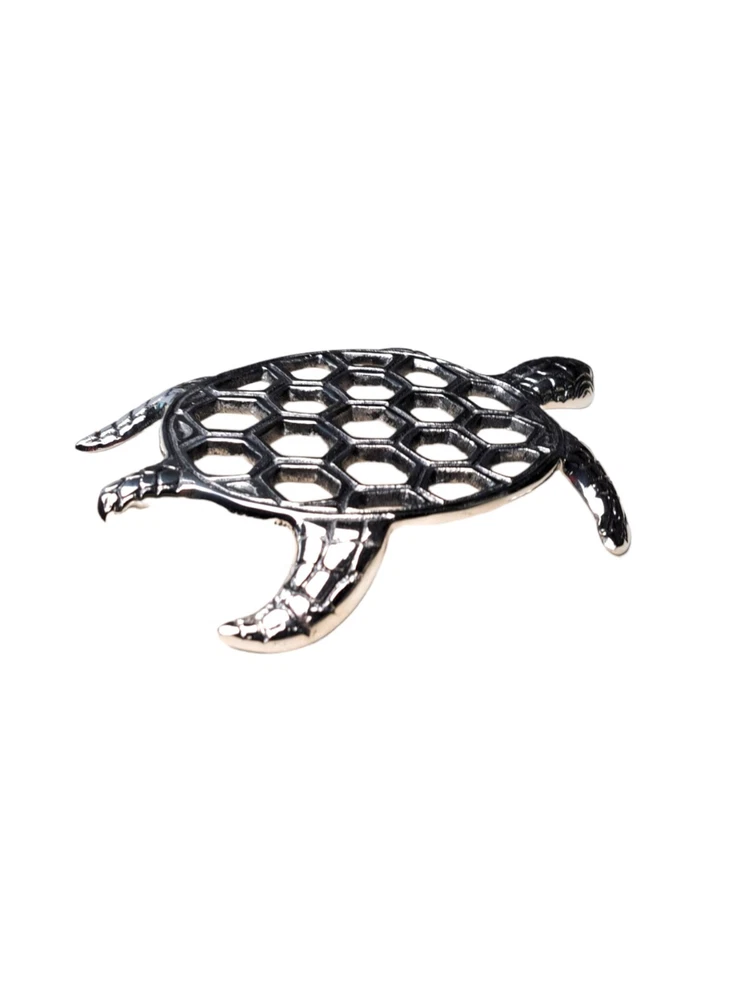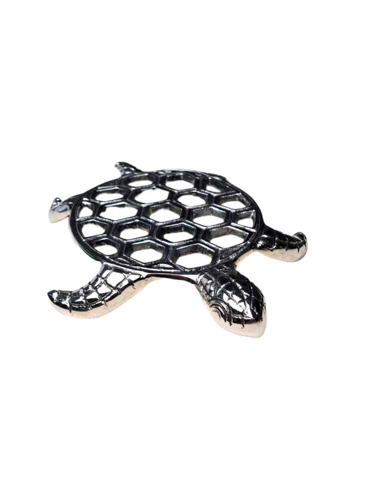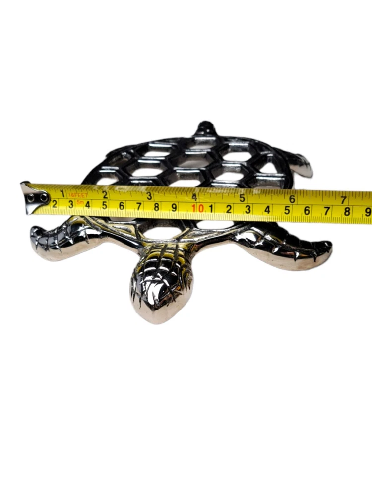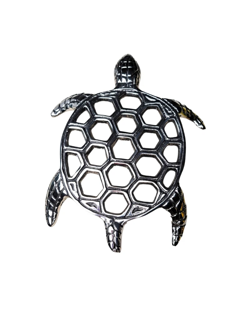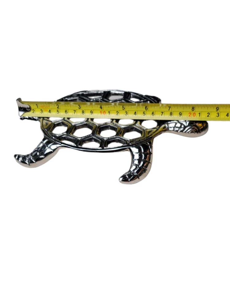 Material:MetalTheme:ArtItem Height:2 inItem Length:9 inFinish:MetallicUPC:Does not applyItem Width:7 ingtin13:Does not applyCharacter:TurtleBrand:Star HomeNumber of Items in Set:1Shape:TurtleItem Weight:9 ozType:TrivetPattern:Sea TurtleColor:Silver