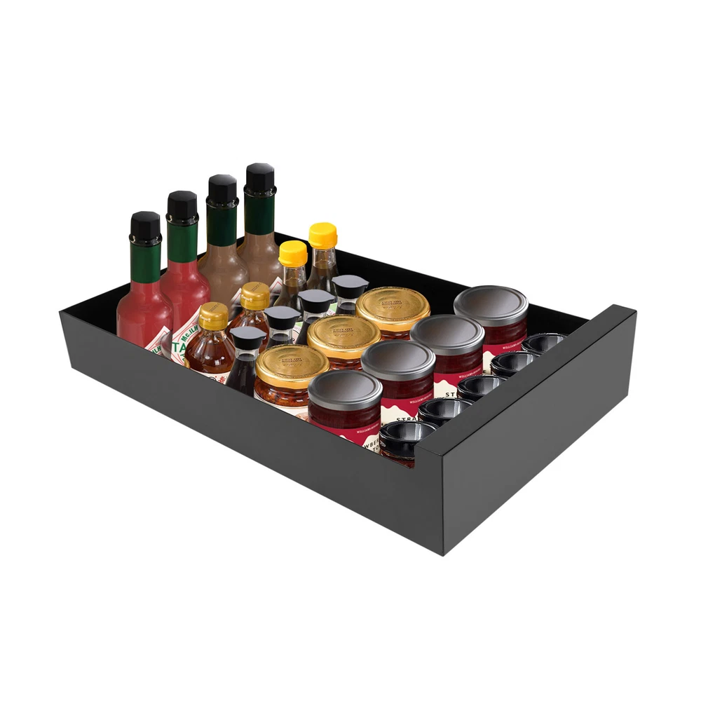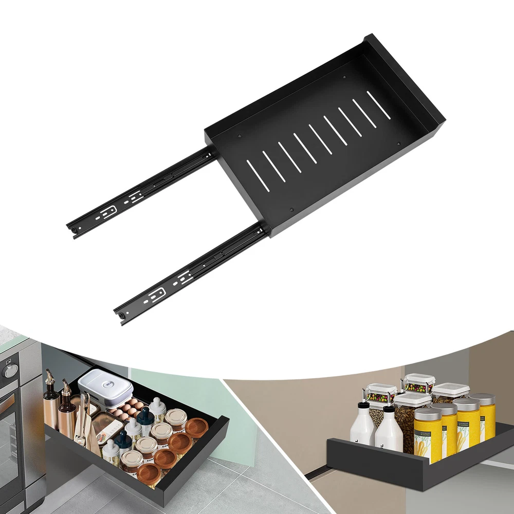 Application This product is widely used as a shelf insert for cabinets and can store cans, baked goods, canned food, spices, tableware, etc. Specification Material: Metal Color: Black Process: Painted Assembly Required: Yes Number of Drawers: 1 Mounting Type: Pull Out Special Features: Extendable Maximum Load: 25kg/55.12lbs Gross Weight: 2kg/ 4.41 lbs Net Weight: 1.8kg/ 3.97 lbs Product Size: 43*25*9cm/ 16.9*9.8*3.5 in Height of Drawer Door Plate: 8cm/3.1in Maximum Tensile Length: 70cm/27.6in Package Size: 44*25.5*10.5cm/ 17.32*10.04*4.13in Package Included 1 * Pull Out Cabinet Organizer 3 * Monkey Grip Tapes Metal Slide Out Cabinet Organizer Pull Out Under Cabinet Slide Out Shelf Description The high-quality pull-out cabinet organizer adopts a retractable design, which makes it easier and faster for you to pick up items. It can be well hidden in the narrow cabinet, making the kitchen look cleaner and more beautiful. The hole-free installation method allows you to quickly install and remove. It will be a powerful assistant for your kitchen storage! Key Features High-quality Material: The product is made of high-quality metal and the surface is painted, which is anti-corrosion, rust-proof, high hardness and strong pressure resistance. Neat and Beautiful: The classic black appearance and simple lines make the product full of modern sense, and the pull-out cabinet organizer can be well hidden in narrow cabinets, thus making the kitchen more neat and beautiful. Easy to Reach : You don't need to unload stuff stored in front to get to anything in the back. The retractable design allows you to easily find all your spices in your cabinet without having to empty out half the contents. Easy to Clean: When you need to clean and organize drawers and cabinets, you can simply separate the drawer from the rail to clean them more thoroughly. And the painted surface is very smooth to clean. Easy to Install: The hole-free installation method can be easily completed even by people without installation experience. You just need to use monkey grip tapes to stick the rail to the cabinet. Storage Assistant: It is not only an ideal choice for storing spices or tableware, but also an ideal solution for using limited space. The pull-out cabinet organizer adds more cabinet space and is a necessity for people who like cooking. Strong Load-bearing Capacity: The product made of high-quality metal has a strong load-bearing capacity (55.12lbs) after being fixed with monkey grip tapes. The sturdy structure can easily accommodate and organize various kitchen items. Ideal for Narrow Cabinets: With a total height of 3.5 inches, this product is ideal for utilizing tight spaces and narrow cabinets. Details Drain Hole: The drain holes at the bottom of the product can effectively filter the residual water in the dinner plate or other kitchen supplies so that the tableware is not easy to breed bacteria. Damping Guide Rail: The damping guide rail at the bottom of the product can withstand about 40 thousand times of opening and closing. It can slide smoothly without unpleasant noise. How to Install 1. Paste the monkey grip tape on the back of the guide rail. 2. Put the drawer with installed guide rail into the cabinet. 3. Press it down in a proper position. Application This product is widely used as a shelf insert for cabinets and can store cans, baked goods, canned food, spices, tableware, etc. Specification Material: Metal Color: Black Process: Painted Assembly Required: Yes Number of Drawers: 1 Mounting Type: Pull Out Special Features: Extendable Maximum Load: 25kg/55.12lbs Gross Weight: 2kg/ 4.41 lbs Net Weight: 1.8kg/ 3.97 lbs Product Size: 43*25*9cm/ 16.9*9.8*3.5 in Height of Drawer Door Plate: 8cm/3.1in Maximum Tensile Length: 70cm/27.6in Package Size: 44*25.5*10.5cm/ 17.32*10.04*4.13in Package Included 1 * Pull Out Cabinet Organizer 3 * Monkey Grip Tapes Notes This product does not contain items in the pull-out cabinet organizer. Please allow the slight color difference caused by the shooting light and the 1-3 cm error due to manual measurement, and make sure you do not mind before ordering. "Quality of life, starting from here!" ——In this store, we have selected a series of high-quality products for you, Make your shopping experience more enjoyable. Come and buy now, enjoy a worry free life! Payment Delivery details Terms of sales About us Contact us Payment We accept ebay payment 。 Fees such as import duties, taxes are not included in the item price or shipping costs. These charges are the buyer's responsibility. Delivery details Shipping: 2-9 working days to: USA Terms of sales We maintain high standards of excellence and strive for hundred percent customer satisfaction. Feedback is very important to us. We hope that you contact us immediately before you give neutral or negative feedback, so that we can address your concerns. It is impossible to address issues if we do not know about them! About us Your satis faction is our ultimate goal. We work hard to earn your trust and future business. Our certified technicians have tested each item before shipping. The unit comes with 1 year limited warranty on all manufacturing defects. a) If you receive a defective item, you may return it or ask for a discount. Please contact us within 14 days after you receive the package. b) What you returned must be intact and in its original packaging as re? u. Customer is responsible for shipping costs of the returned item. c) We will cover the cost of shipping back t with the shipping rate indicated in the registration page. We will send you a new unit or refund the full payment you paid. Thank you. Contact us Business Hour Business Hour: Monday To Friday: 8:30 AM to 5:00 PM (Beijing China time) Due to time zones, our reply to your questions may not be immediately. But within above working time, we will reply your email within 24 hours. If it's non-workdays, please kindly be patient and wait till Monday. Please contact us with ebay 