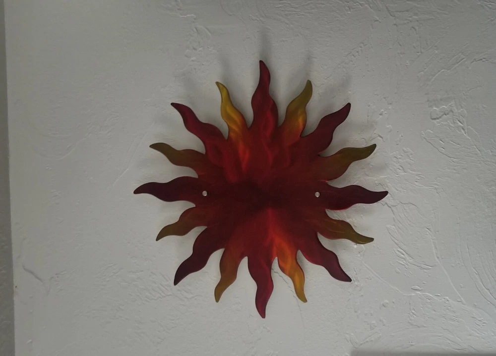 Metal wall decor sun large red yellow 24" wall hanging sun. Automotive candy paint with a clear enamel finish on the front and back. Stainless steel standoff hardware is included. Stainless steel standoff mounting hardware is included. Thank you for visiting our shop! Each piece is made to order hand drawn and hand cut original metal art work and sculptures. We can make any design to custom specifications. Everything is made in the USA Twin Falls Idaho. Our shop has two workers we are a husband and wife team that specialize in high end interior and exterior custom art work. Product Details: -Stainless steel standoff hardware is included - Packed with a thick cardboard wrapped in thick Styrofoam or bubble wrap - Easy to clean with a microfiber cloth. If pieces are left outside we recommend using a clear enamel each year to keep the piece protected - Does not require special lighting but the more light it has near it the brighter it will shine either sunlight or indoor lights - High quality materials not the thin cheap metal art you see in stores - Will last forever much better than decals they can be passed on to kids 50 years later -Can be hung with a nail or metal standoffs included - Easy to Hang -Clear enamel & acrylic automotive paint on the front and back -Thick 16g steel or 080 aluminum -Hand drawn original art -LED lighting can be added for an additional cost $125 if we buy and install the lights $25 if you send us the lighting. Lighting is not included in any signs it is an additional charge -Signs hang from standoff wall mounts or aluminum extrusion mounts -Larger pieces are packed and insured through fed-ex and are wrapped with 1/8" foam and 1" foam board Custom metal wall hanging art. Made to order home decor. Hand drawn and hand cut designs with 16 g steel or .080 polished aluminum (thicker metal can be used for an additional cost.) Custom designs and sizes available message us for a free quote! Our Shop Process: Our shop uses both High-Quality Steel and aluminum sheet metal hand drawn. Each piece can be made with aluminum instead if requested. Pieces are hand cut and polished with a sanding disc grinding patterns are put on the metal custom patterns can be requested. Our process produces a stunning one of a kind and captivating art piece. A matte finish can also be used if requested glossy finish of the metal. The patterns and automotive grade paint we use shows a depth and 3-D characteristic that isn't seen in most art pieces. We can also use a rustic finish, copper patina, heat patina any color or black if requested. High quality Automotive grade Clear enamel Gloss Coating ensures that pieces can be hung indoor and outdoor colors are vibrant with sun or indoor light the brightness changes depending on the light reflecting from the piece they look 3- Dimensional. If they have no light the color will be darker and the grind pattern will not show as well. We send mounting hardware with each piece or can weld it to a garden stake for additional cost. Custom Sizes and special requests Are our main Specialty Want a custom made artwork of metal made to specific dimensions? Message us today for a free quote. We make business signs, wedding decor, fabrication projects, trellis, gates, fire pits, panel sets and we can install led lighting if requested! Please message me with questions or requests we will help build a custom design if requested. Made with a thick 16 g steel not the thin tin found in stores not super heavy either can easily be hung with a nail. Metal standoff hardware is included the piece will sit at least 1/2" off the wall with a brushed stainless finish. Very classy and unique wall decor. Sturdy and handcrafted. Thanks for your interest