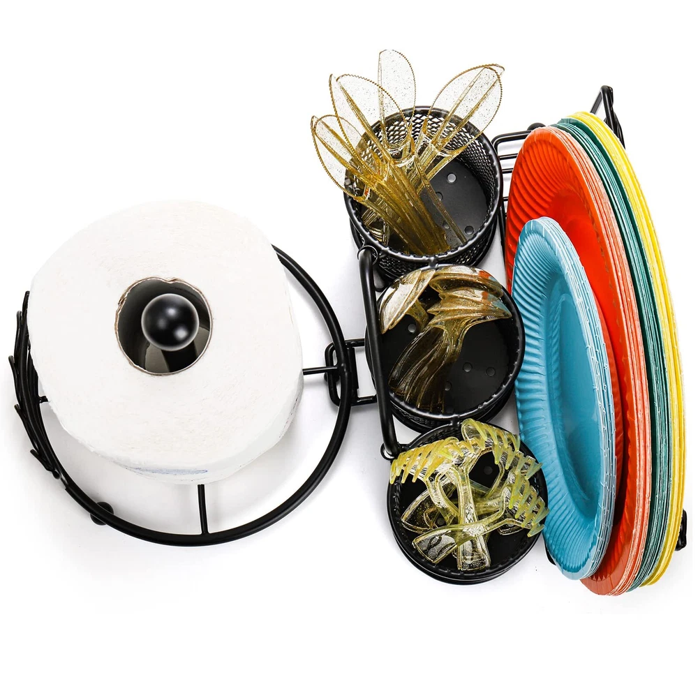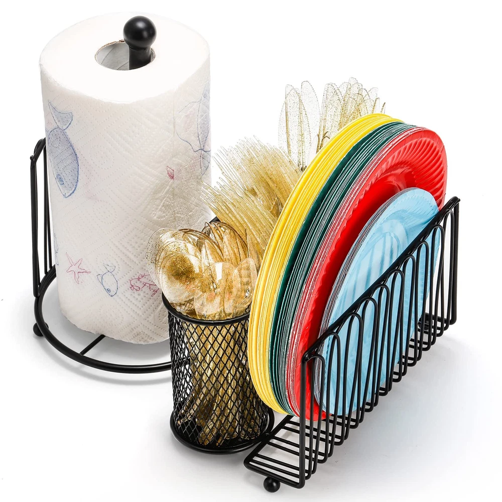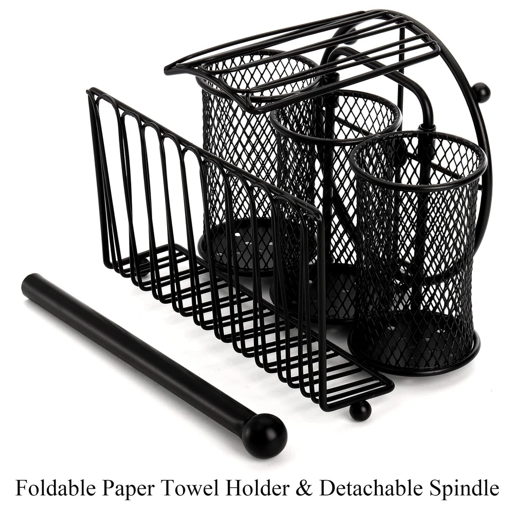 Metal Caddy OrganizerOur folding mesh caddy with a plate holder, a towel holder and 3 utensil holders allows you to display and serve flatware, paper towels, and dishes in style.The paper towel holder can be folded into the caddy, and the handle can be removed for easy storage.The buffet server saves a great deal of space and would also make a wonderful housewarming gift.Featuring a pull-out handle, it is easy to move to a picnic, buffet, or dining table.With our caddy organizer, you'll always have utensils, cookware, napkins, and paper towels neatly arranged, which is ideal for both indoor and outdoor entertaining. metal flatware caddy organizer comes with 1 paper towel holder, 1 plate holder, 3 utensil holders. Total size (assembled): 12.4"L x 9.5"W x 10.6"H. The paper towel holder can be folded up, and the spindle is removable for easy storage. Sturdy Steel: Our silverware caddy organizer's robust construction is created from high-strength carbon structural steel and coated with a food-safe, non-BPA powder coating to ensure its enduring brightness even in harsh conditions. Practical Organizer: With mesh holes on the bottom and ventilation area on the side, the cutlery caddy allows for quick utensil drying. Pull-out handle in the middle makes it easy to carry the organizer around. Elegant Style: The kitchen utensil holder has an antique look thanks to its nicely greased black finish. This is an attractive piece to have in kitchen, dining room, for parties, wedding receptions, family gatherings, and everyday use. Multi-Use: The 3 cylinder sections in the center are ideal for storing utensils such as spatulas, flatware, ladles, whisks, spoons, forks, and knives. 2 sections on the sides are suitable for neatly organizing your napkins, paper towels, and drying plates.