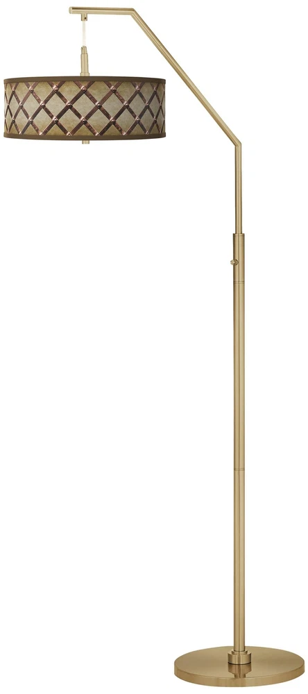 Shop Sale > Chandeliers Ceiling Lights Lamps Wall Lights Outdoor Lights Fountains Ceiling Fans Furniture Decor Metal Weave Giclee Warm Gold Arc Floor Lamp Style #187C9 PRODUCT DETAILS: 71 1/2" high overall. Base is 14" wide. Shade is 16" across the top x 16" across the bottom x 5 1/2" high. Weighs 23 lbs. Uses two maximum 100 watt standard-medium base light bulbs (not included). 4-position stem column switch. Switch positions: Right bulb on, left bulb on, both on, both off. Contemporary arc floor lamp from the Giclee Glow brand. Translucent Metal Weave shade with diffuser. Shade has the exclusive pattern and is custom made to order. Shade printing process U.S. Patent # 7,347,593. Warm gold finish. Metal construction. 8-foot long cord. DESCRIPTION: Add style with this contemporary arc floor lamp design. It features a warm gold finish and a shade with a bottom diffuser to prevent glare. The shade shows off an exclusive Metal Weave shade pattern and is giclee printed and made to order. Stem switch allows for two different lighting levels for ultimate convenience. Shade printing process U.S. Patent # 7,347,593. *Free Shipping applies only to orders shipping to the 48 continental United States that qualify and meet the minimum purchase requirement; standard shipping only and select products excluded, including freight and oversized items. Free Returns valid on select items in United States only; does not apply to freight, clearance, Daily Sale, designs with giclee art shades, Color Plus and Tiffany Color Plus brand items, or certain items with designer shades.